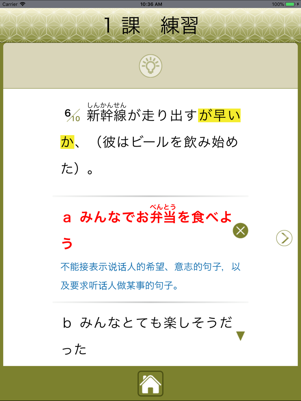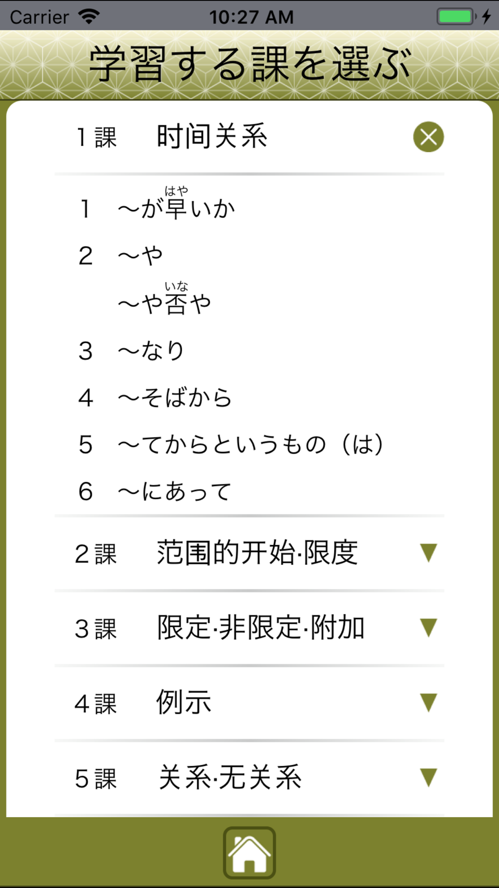 “目录”:将每个句型按照50音图顺序、课的顺序、自己学习过的项目顺序等排列归类,可以自行选择自己想学习的句型。