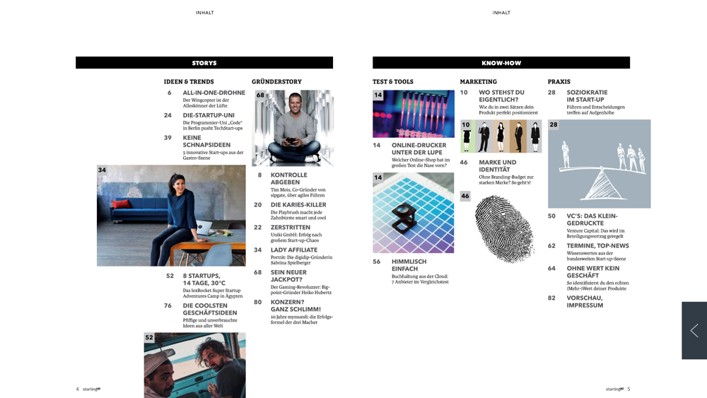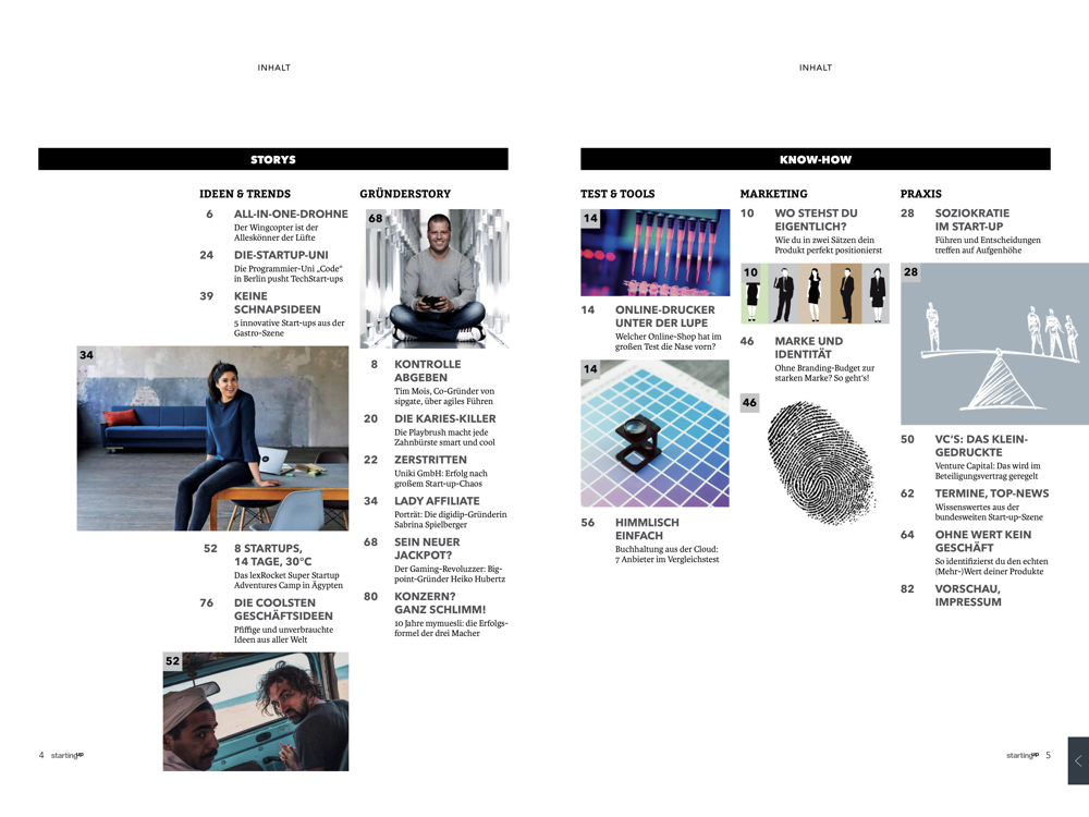 StartingUp ist das Magazin für Gründerkultur, unternehmerisches Denken, Kreativität und Innovation. Neben praktischen Tipps und nutzwertem Content für Gründer und junge Unternehmer stehen mutige Konzepte und neue Ideen für neue Märkte im Mittelpunkt des Inhalts. Viele best-case-studies und spannende Entrepreneur-Stories bieten Inspirationen für neue Geschäftsmodelle jenseits der eingefahrenen Wege. Die wichtigsten Rubriken von StartingUp sind: