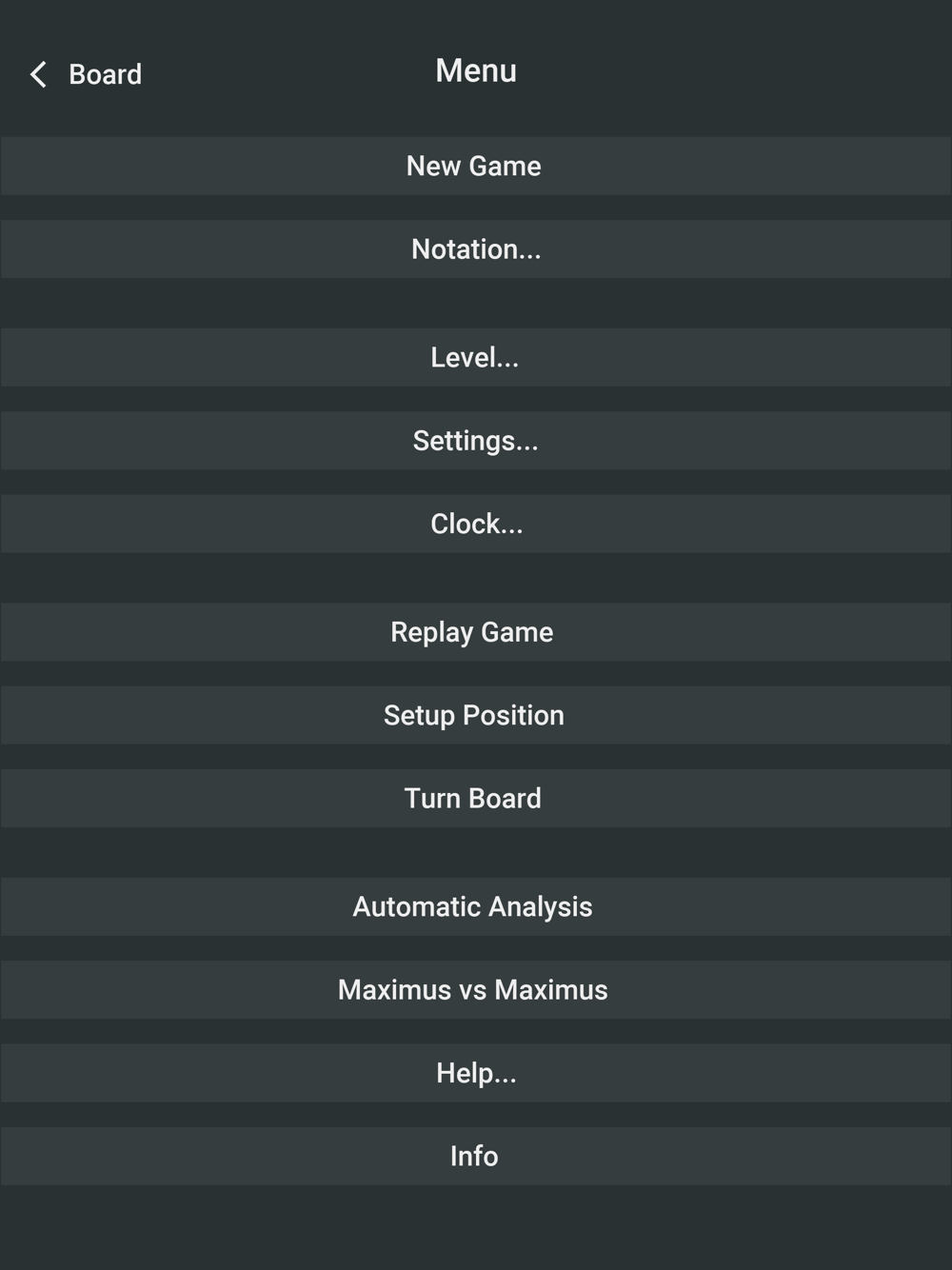 * Other options: turn board, setup position, automatic replay