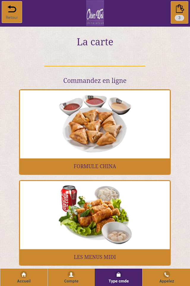 L'application iphone/ipad de China Wok vous permet de commander en ligne ou par téléphone via votre application . Vous pouvez consulter notre carte et choisir vos produits .