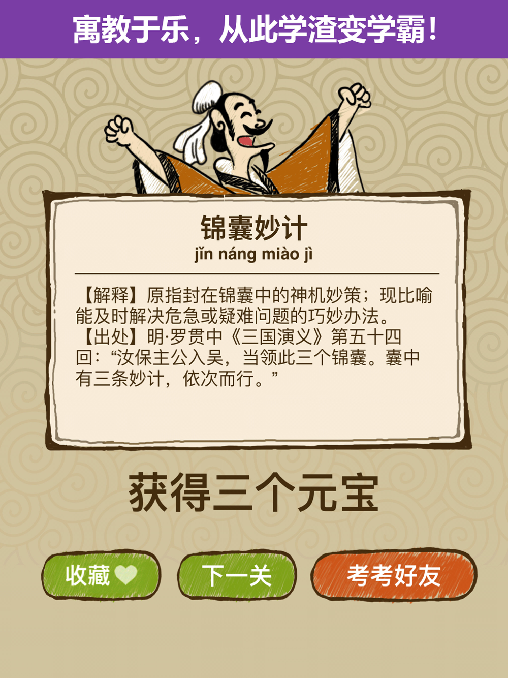 1800多个成语关卡,寓教于乐的看图猜成语游戏!复古画风,诙谐有趣的原创谜题,是一款老少皆宜的中文猜谜游戏!