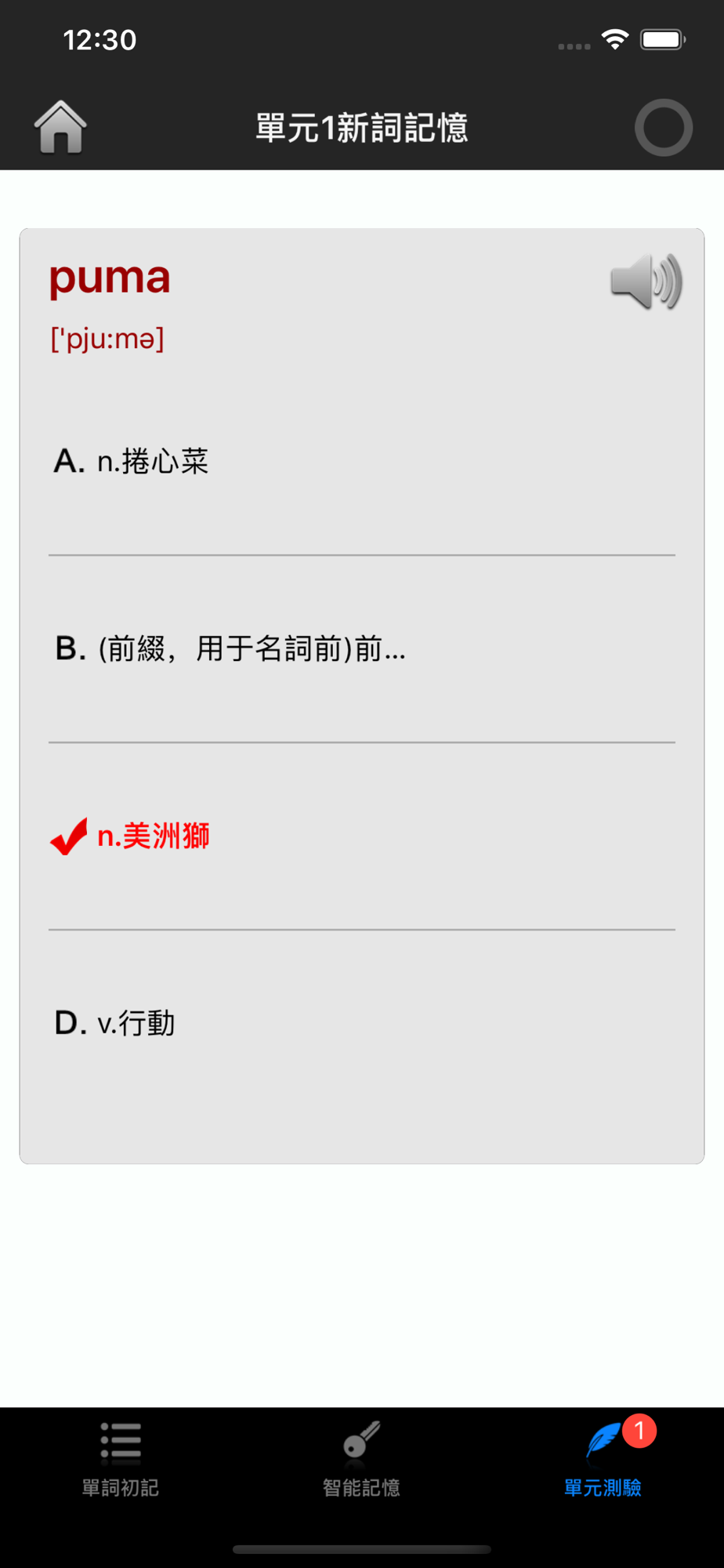 *测试检验:每个单元的单词学习完毕后,系统会自动生成测试题目,您必须在测试中达到至少90%的准确率才能通过测试,否则下一个单元不会开放。此过程确保您学习的有效性,保证每一个记忆点都能最大化巩固。