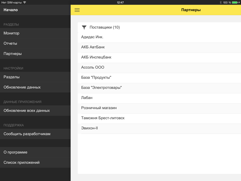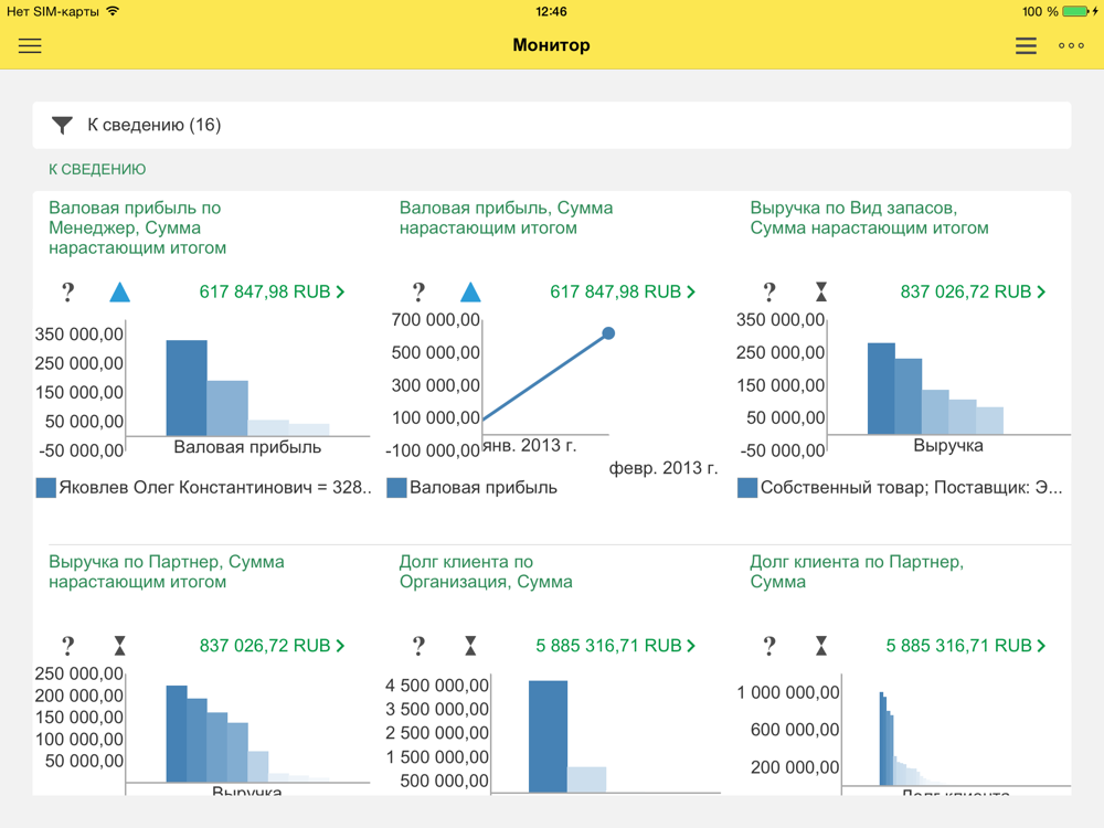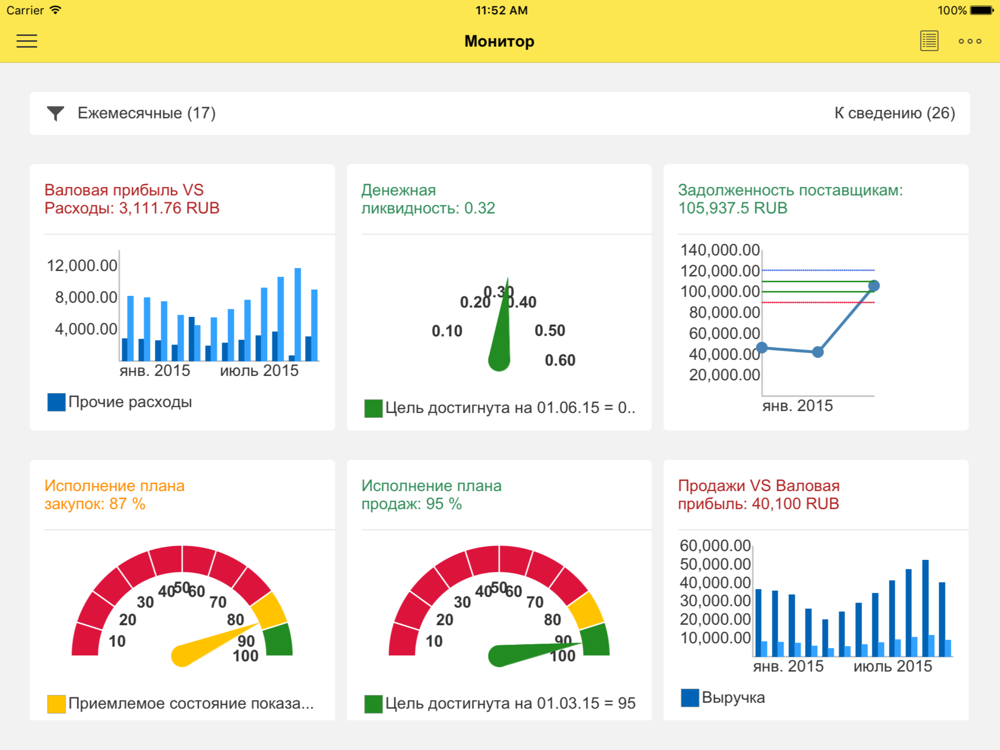 Приложение реализует базовые возможности мониторинга целевых показателей, просмотра отчетов, просмотра информации о партнерах совместно с коробочным решением "1С:Управление торговлей 8" или "1С:ERP Управление предприятием 2.0".