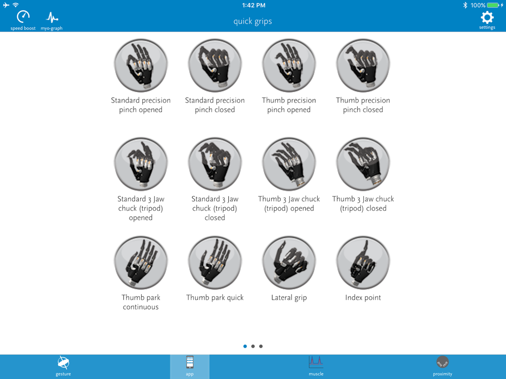 • Instantly access 24 quick grips and 12 fully customizable my grips™ (available with i-limb quantum and i-limb revolution, 14 quick grips with i-limb ultra and i-limb digits, 12 quick grips with i-limb access and i-limb select) providing effortless control of the prosthesis with a single tap of your mobile device