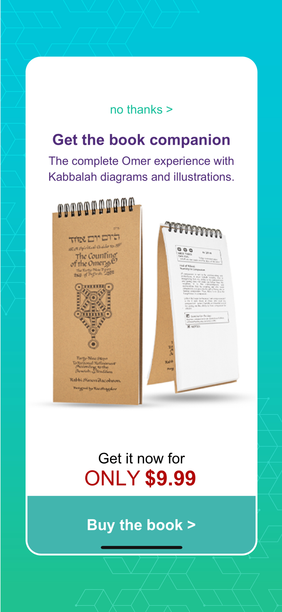 ABOUT: Take advantage of this powerful span of time to explore your psyche, refine your life and elevate your soul. The spectrum of human emotions divide into 49 different attributes, each one corresponding to one day in this 49-day period. Unlike other Omer counters, The My Omer app is the first of its kind to provide daily meditations and exercises to enhance your life and personal relationships based on thousands-of-years of Kabbalistic wisdom.