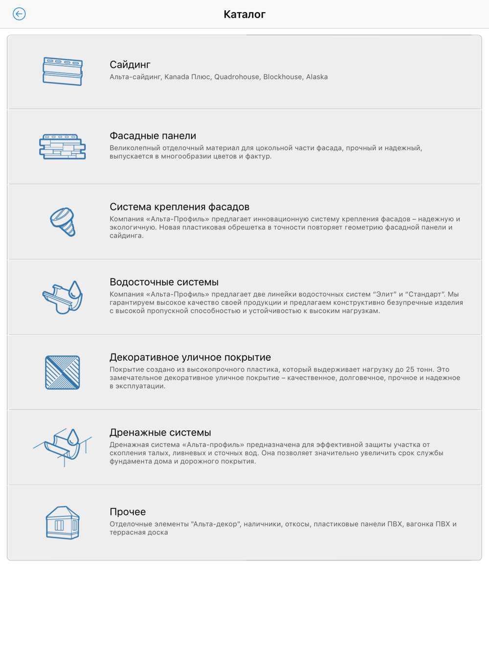 Альта-Профиль - это интересное и простое в использовании приложение от крупнейшего производителя отделочных материалов из ПВХ. С помощью нашего приложения вы можете смоделировать будущий фасад своего дома! Комбинируйте сайдинг и фасадные панели, сочетайте их текстуры и цвета - и вы получите огромное удовольствие от казалось бы скучного этапа выбора облицовочного материала для фасада вашего дома. Вы можете рассчитать необходимое количество материала на калькуляторе сайдинга, а затем смоделированный дом и расчеты сохранить и отправить на свой E-mail, а также поделиться с друзьями в социальных сетях. В приложении имеется полный каталог продукции компании «Альта-Профиль» и важная информация об особенностях производства сайдинга и выбора материалов для отделки дома. Кроме того, приложение само найдет ближайшего к вам дилера, реализующего продукцию нашей компании, и поможет связаться с ним.