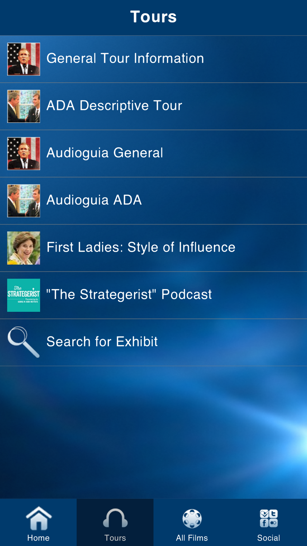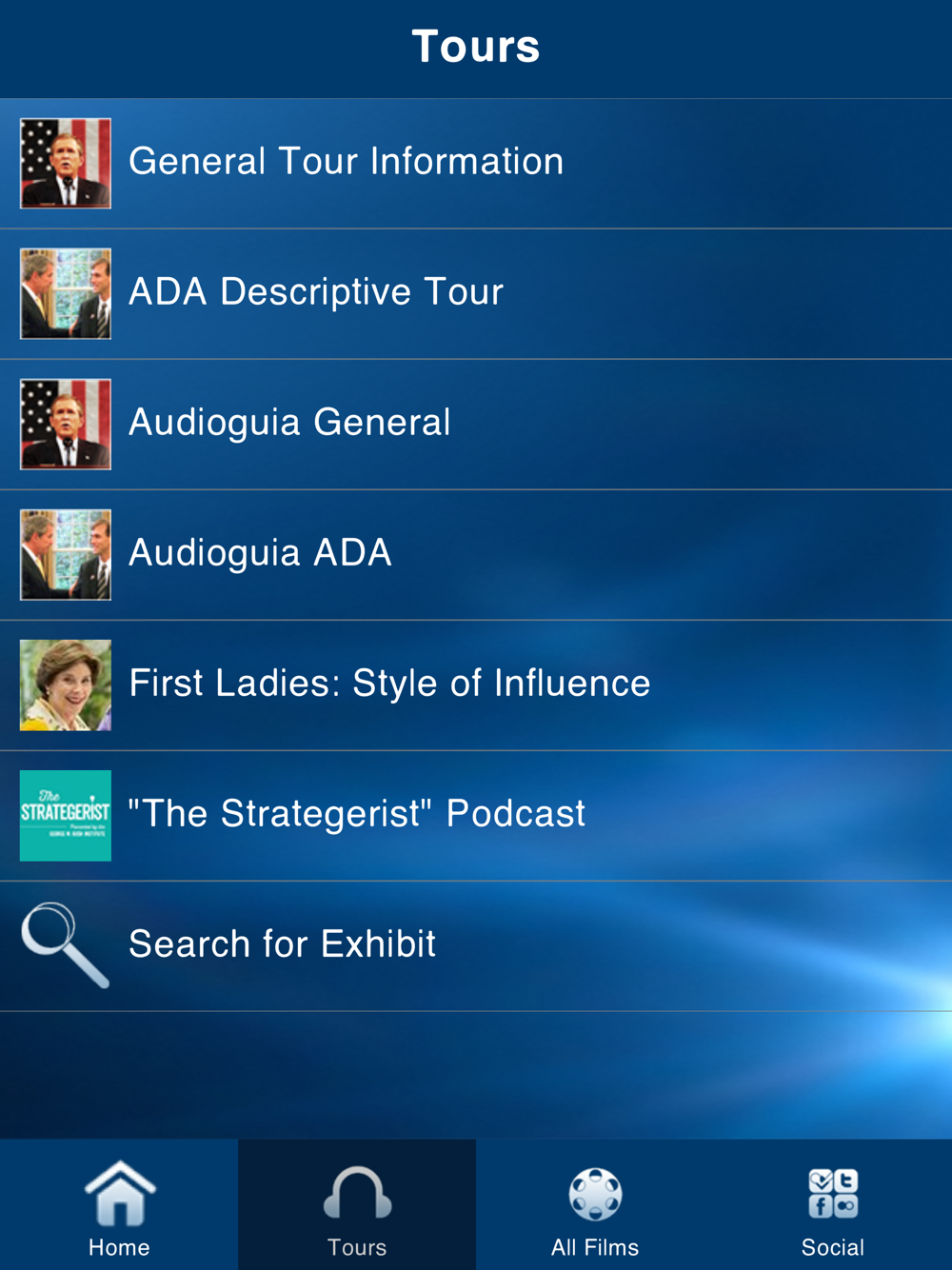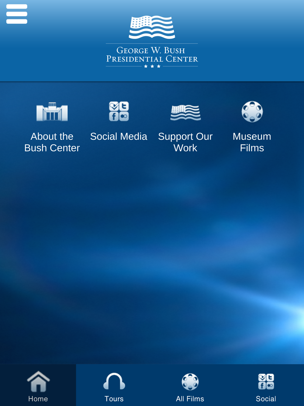 When outside the Bush Center, the app provides information about the George W. Bush Presidential Center, the archives, and a calendar of events, and describes the tour and film content available at the Bush Center.