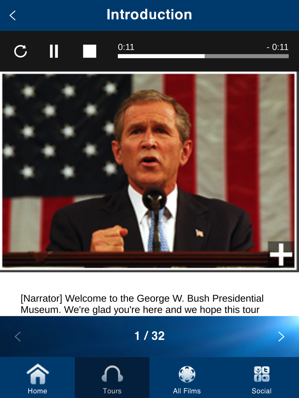 This application is designed to provide information about the George W. Bush Presidential Center’s exhibits and enhance your visit to the Museum.