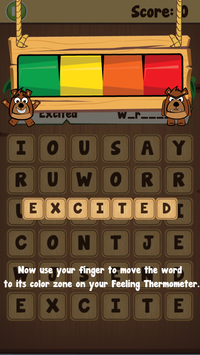 Buddy is looking for new words to use when talking about his feelings. In this feelings word search, swipe your finger across the letters to make feeling words. Words are hidden backwards, forwards, diagonally and bent around corners. Once you find a feeling word, drag it to its corresponding color zones on your Feeling Thermometer. Green feelings are the ones that feel really comfortable, while red feelings are the ones that feel really uncomfortable.