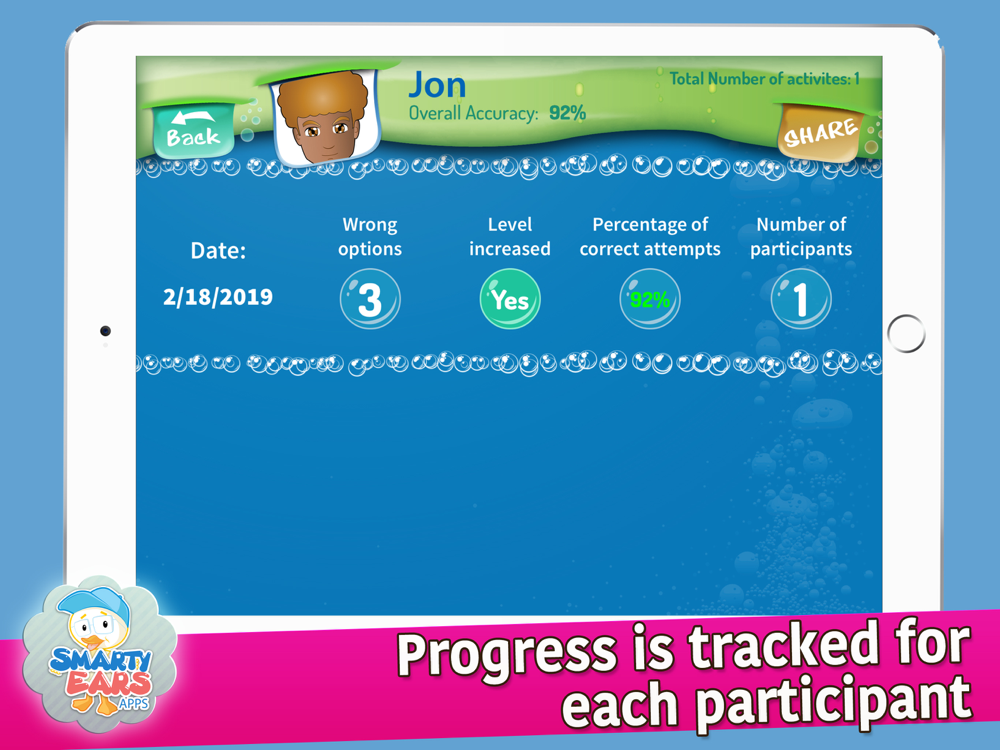 Syllable Splash also includes a setting that will automatically adapt to fit the child’s skill level. In the beginning, the adult has the choice of the number of foils (incorrect choices) available (1-3) and to automatically increase the difficulty. If the child scores 10 correct answers in a row, the app will automatically add another foil (up to 3). This is an easy way of increasing the difficulty level to keep it within the child’s zone of proximal development.