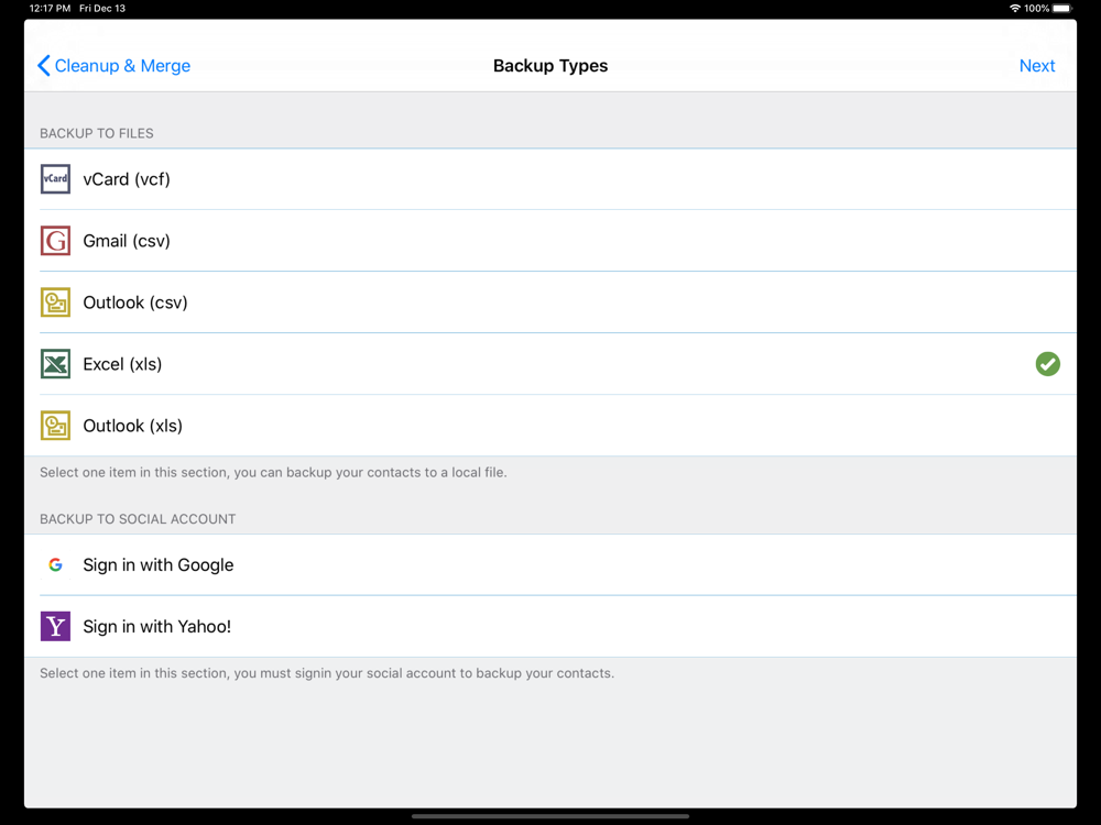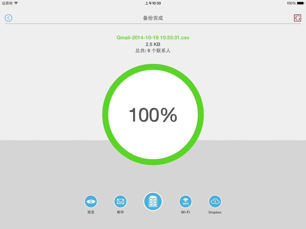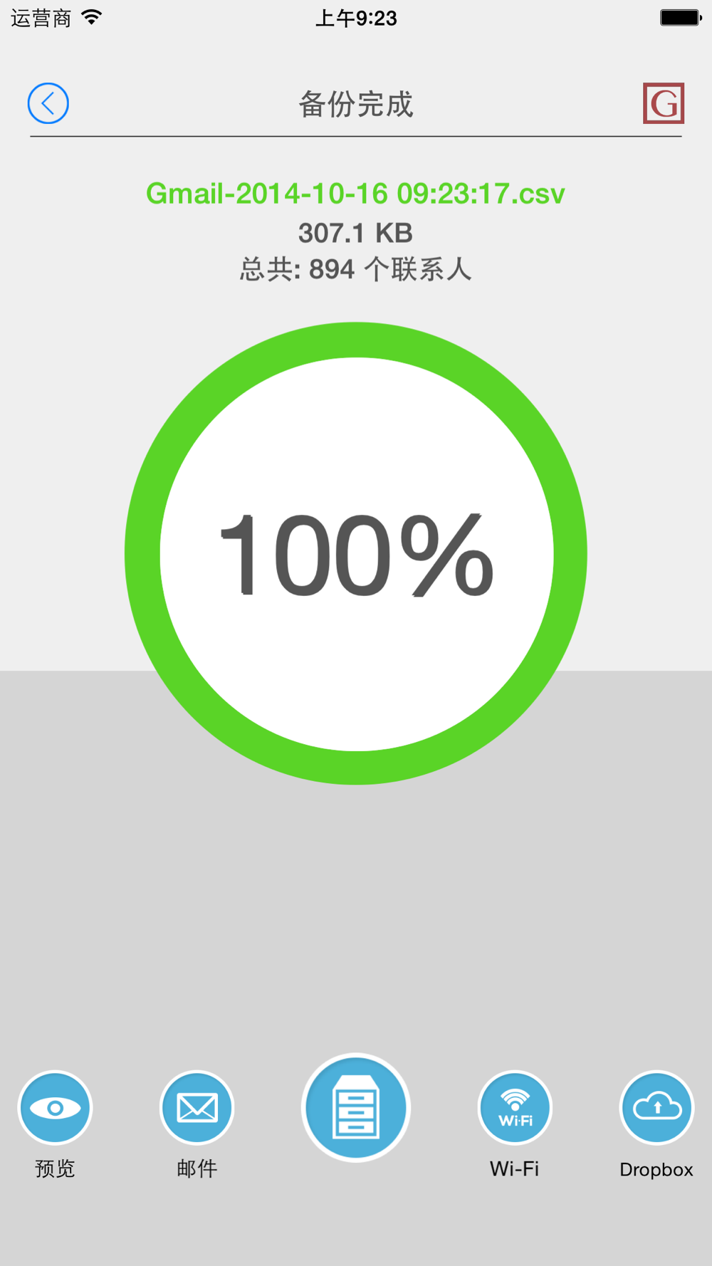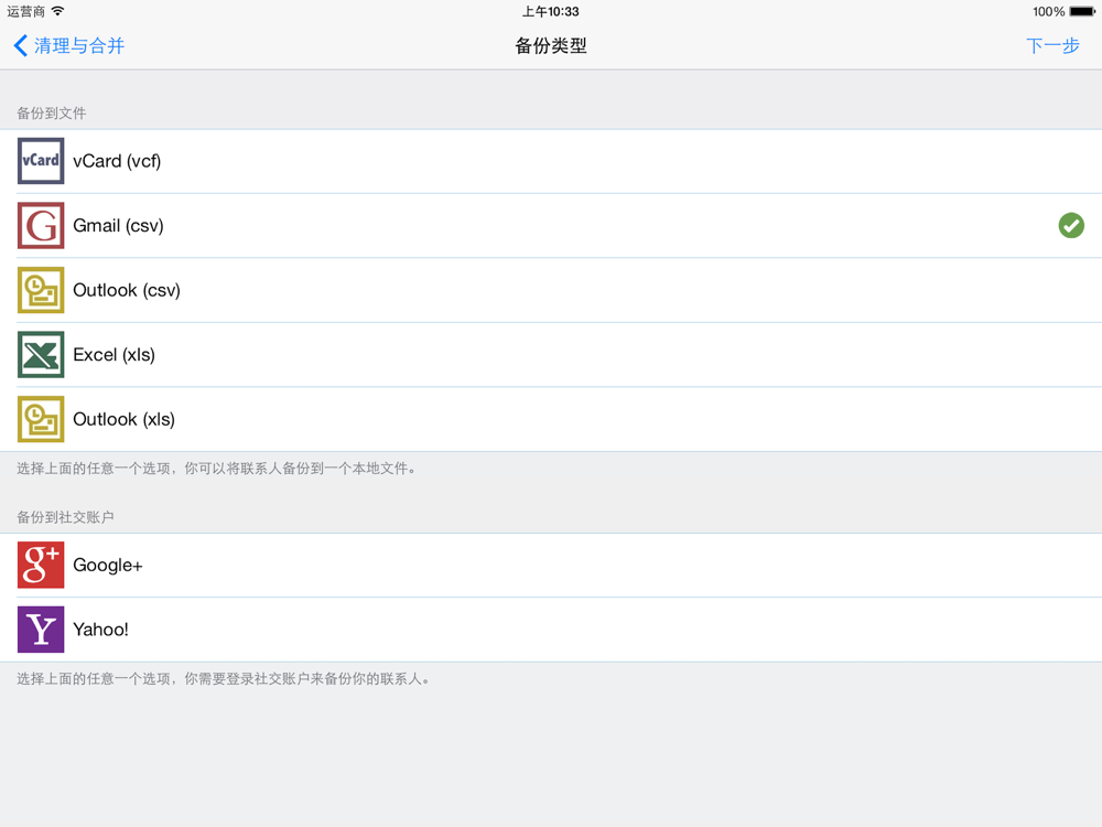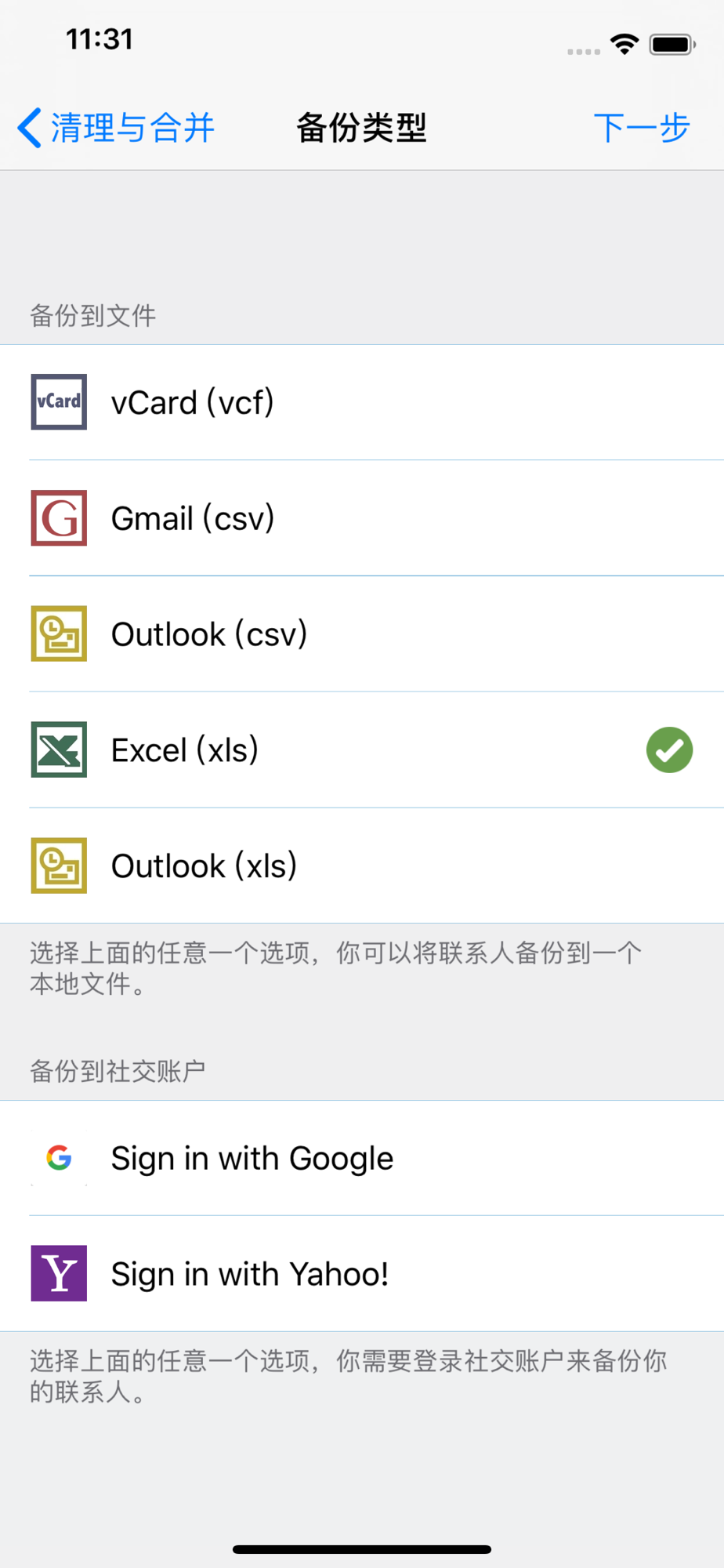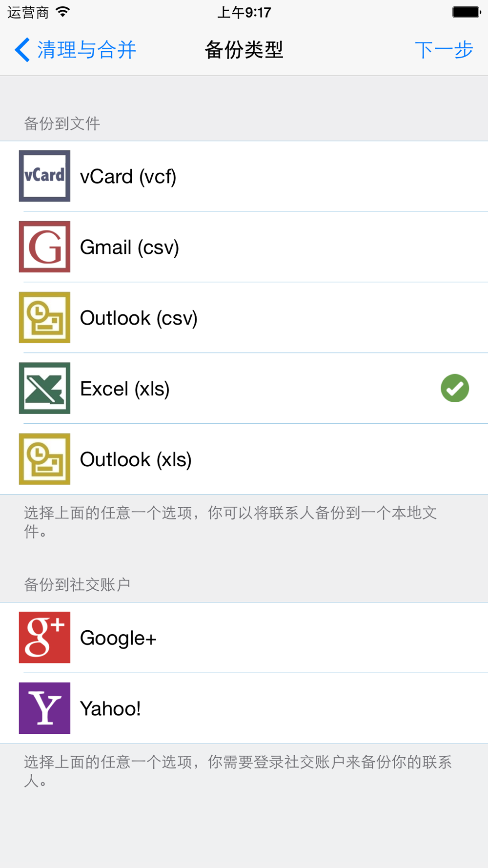 *)应用允许用户在合并前,将指定账户内联系人备份到CSV(Excel)以及VCF(vCard)格式文件,保证用户通讯录的安全