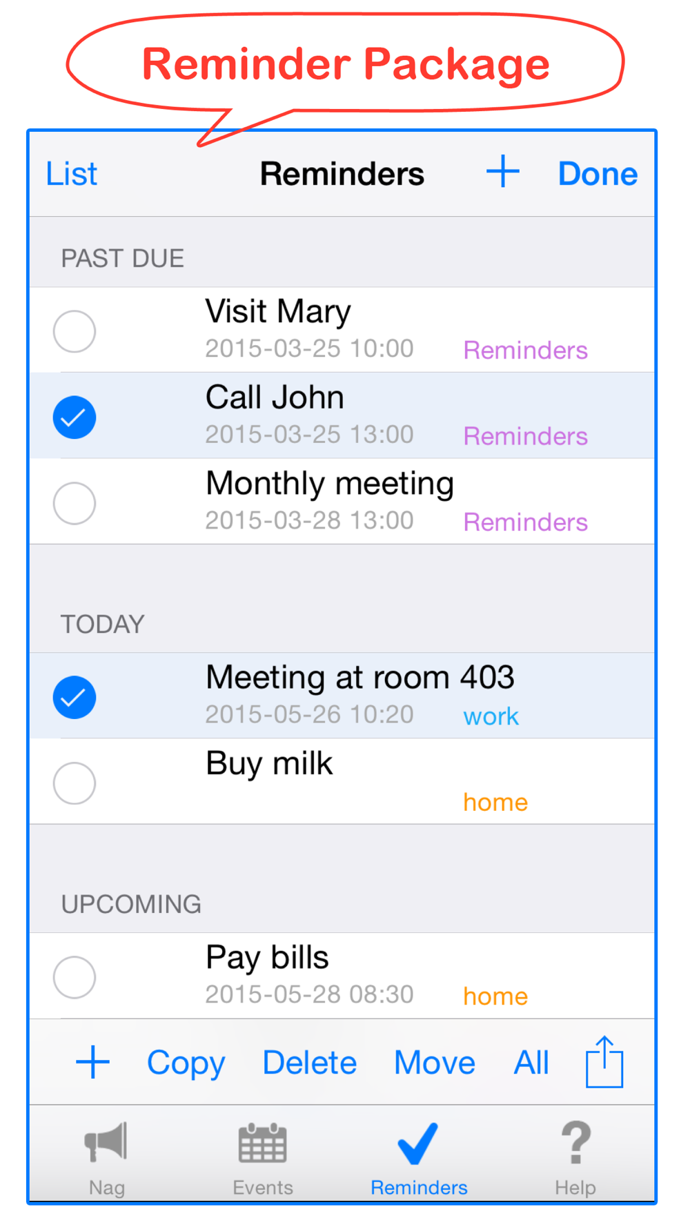Nag is an add-on to the built-in Calendar and Reminders app. All activities are synced with your Calendar and Reminders.
