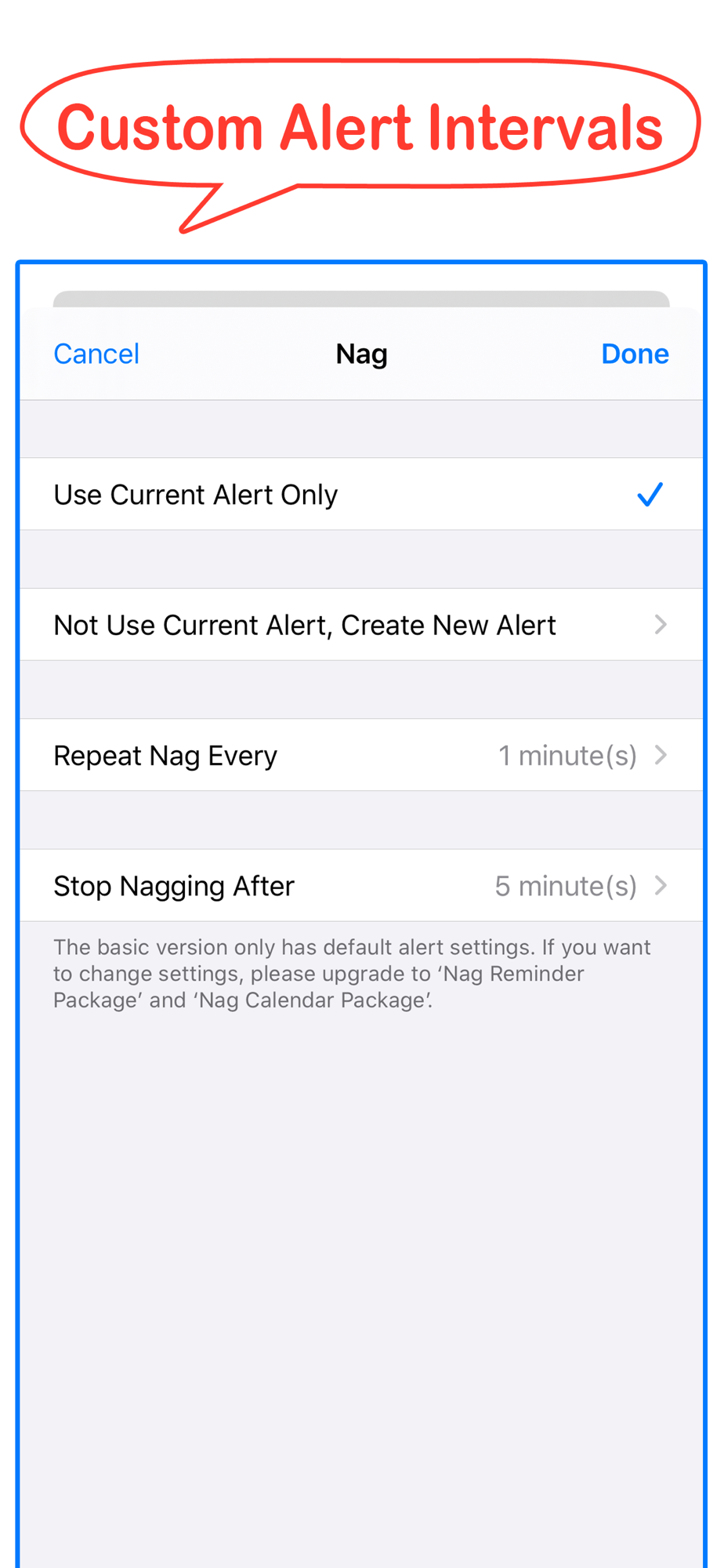 The basic version only has default alert settings. If you want to change settings, please upgrade to ‘Nag Reminder Package’ and ‘Nag Calendar Package’.