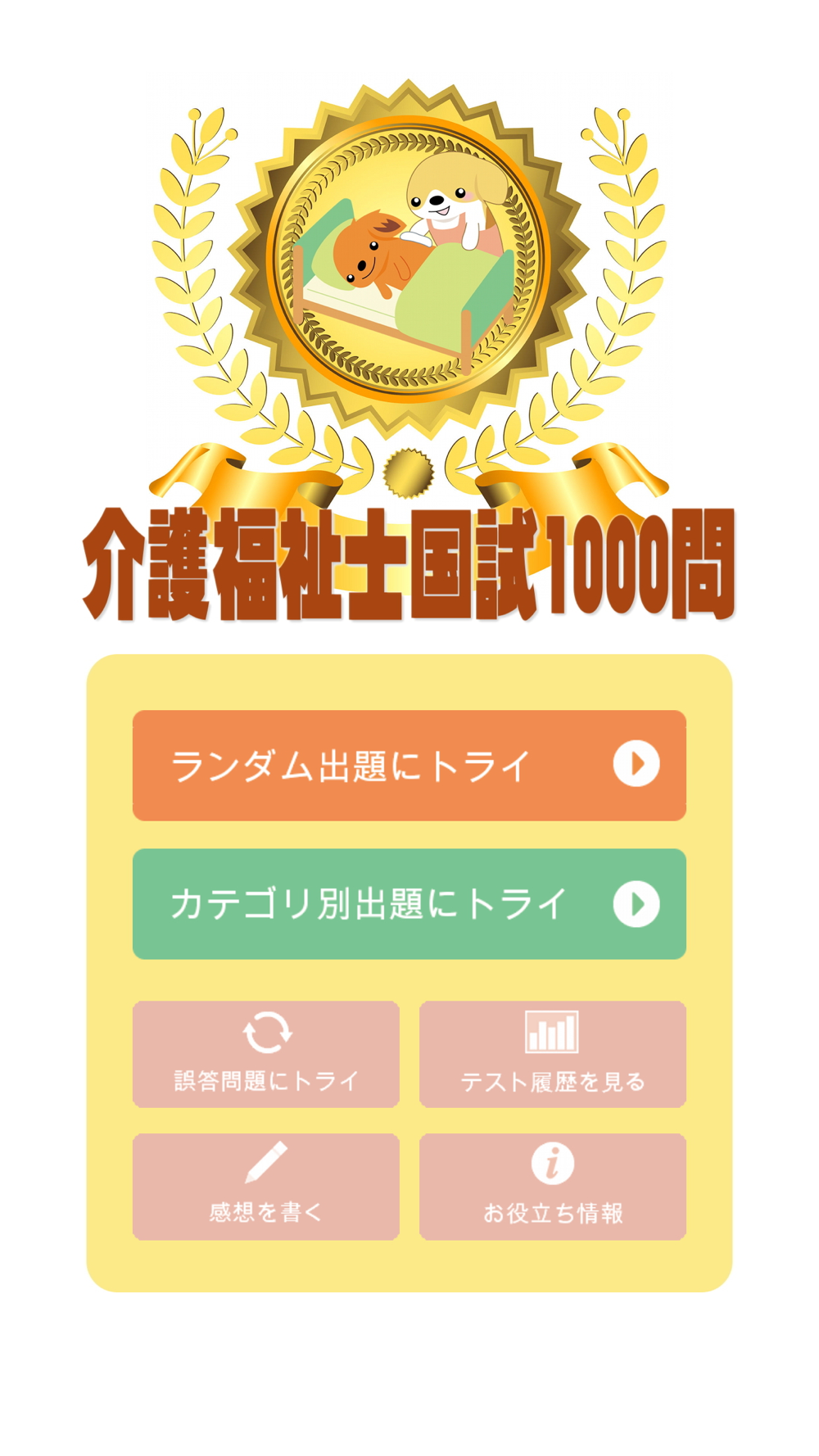 介護福祉士国家試験の解説付き問題が全て無料で!介護福祉士を目指すあなたの大きな味方です。「介護福祉士国試1000問」は、その名の通り、過去の国家試験で出題された1000問を収録したアプリです。もちろん、追加の有料問題や会員登録なども無く、全て無料です。基本はランダムで20問出題されますが、カテゴリ毎にトライすることも可能。更には、間違った問題のみ再トライできる機能や、試験結果の履歴保存、介護福祉士向けの各種お役立ち情報も。さあ、あなたもこのアプリを使って目指す目標にトライして下さい!