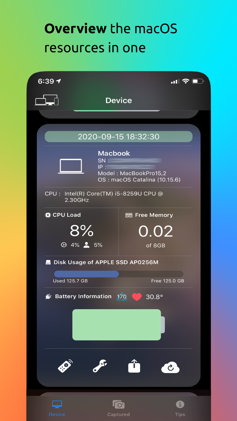 Display Status of CPU Loading, Memory Used, Top 4 Apps using memory, Storage Capacity, Network Traffic and System Uptime.