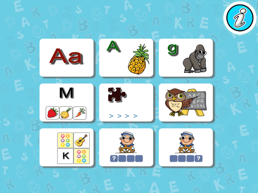 Auf der Fläche gibt es 20 Karten. Es geht um die Spielversion des Spiels Memory – man soll einen Buchstaben mit dem entsprechenden Bild zusammenfügen ( A + ABEND, H + HUND usw.).