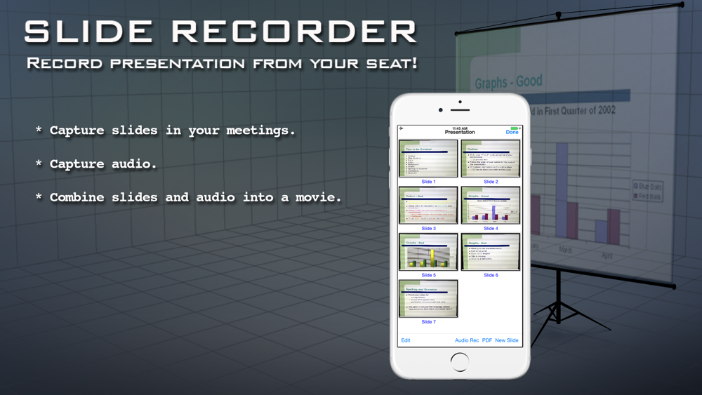 You can take the app to a conference or meeting, and record the presentation’s slides using the device’ camera and audio using the device’s microphone. Even if you are not sitting directly in front of the projection screen, you can still capture the full slides thanks to the app’s built-in image processing engine.