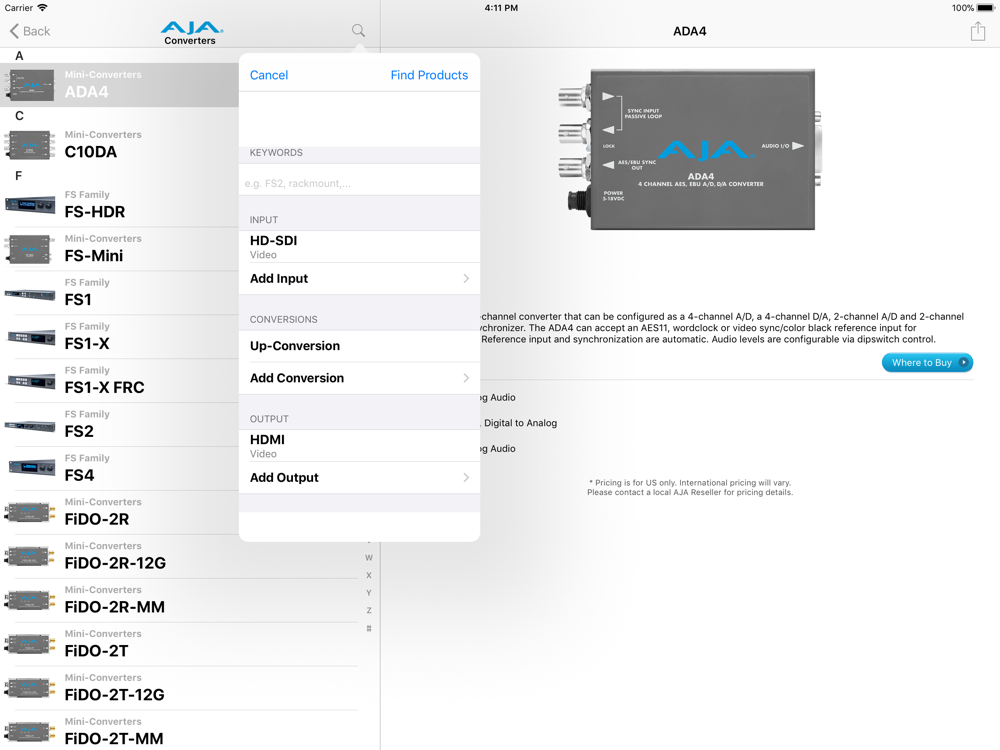 In addition, you can discover where to buy the AJA Mini-Converter of your choice anywhere in the world by selecting "Where to Buy" from the product detail listing.