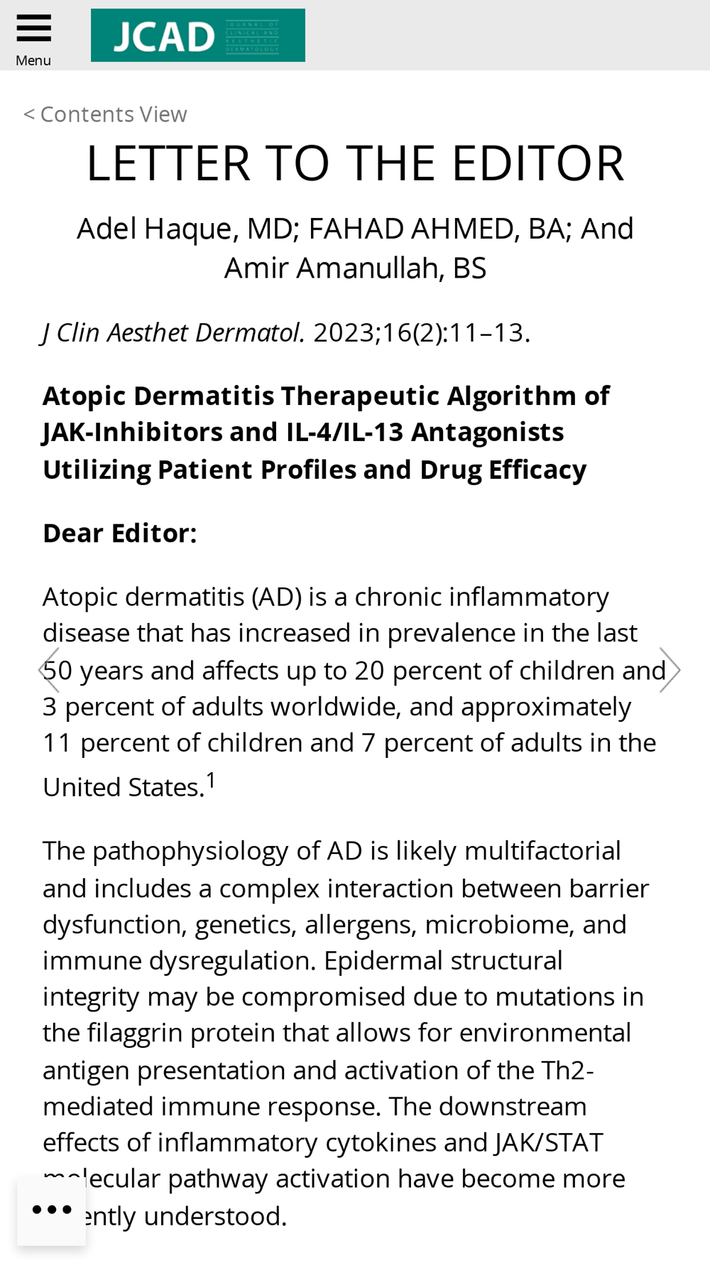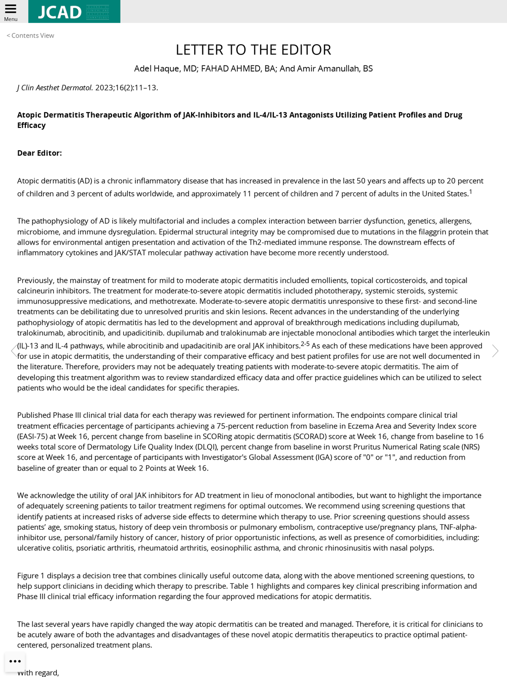 Journal of Clinical and Aesthetic Dermatology (JCAD) is a peer-reviewed publication that has already become an important addition to the field of dermatology. Under the expert editorial leadership of James Del Rosso, DO, and Philip Werschler, MD, JCAD provides dermatologists with up-to-date, evidence-based information that can be applied to their daily practices. JCAD offers its readers original research, practical discussion on the latest research, comprehensive reviews, didactic case reports, and provocative commentaries on contemporary topics relating to both clinical and aesthetic dermatology, written by key opinion leaders as well as practicing clinicians who are “in the trenches,” providing vital balance to the research-rich literature that is already available. JCAD is the official journal of the American Cutaneous Oncology Society and the American Acne and Rosacea Society. JCAD is indexed on PubMed Central, Scopus, EMBASE, and CINAHL Plus.