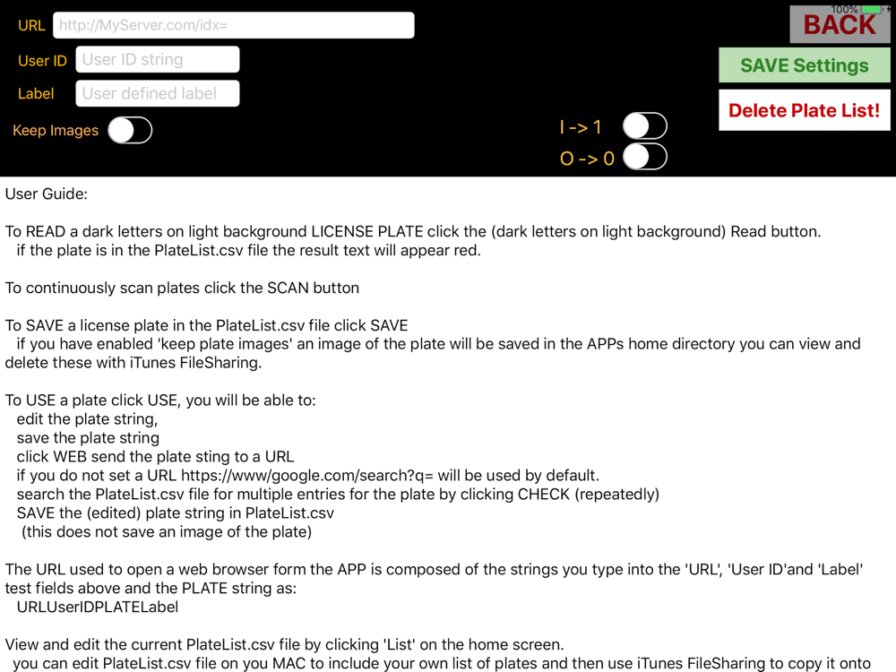 A text file "PlateList.csv" containing a list of number plates and owners can be loaded into the application via iTunes FileSharing.