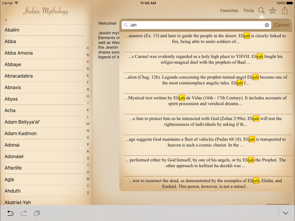 Download the most comprehensive judaic mythology encyclopaedia that can fit in your pocket. Don't waste time looking for the information you want all over the internet, everything is right here at your fingertips without any internet connection required.
