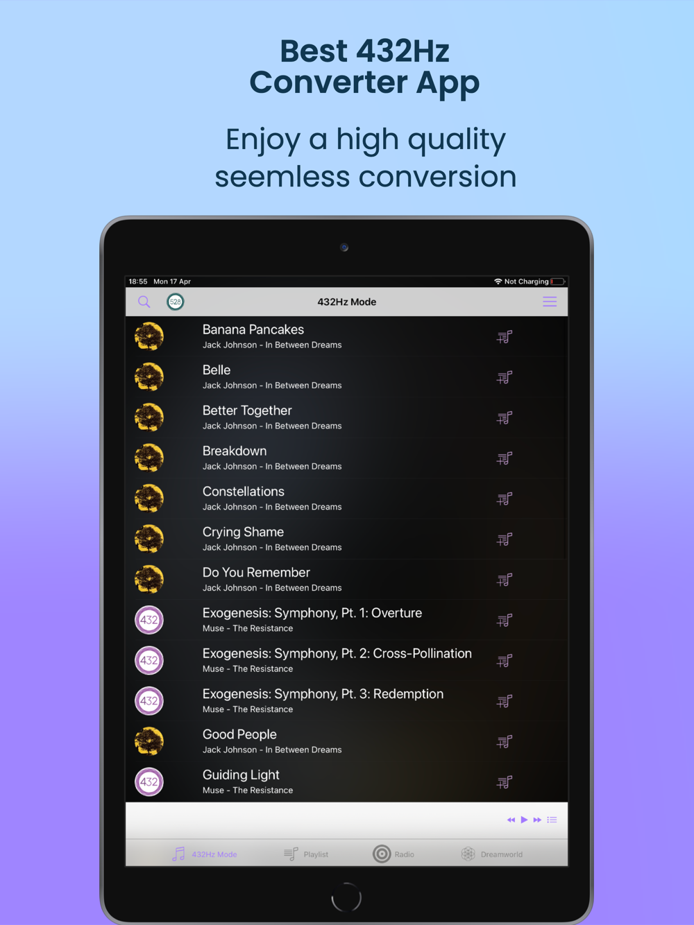 The 432 Player allows you to pitch shift your music to the 432hz tuning. It offers no ads, full access, EQ, no limitations, and no in-app purchases. By using this player, you can enjoy the brighter feeling it brings while experiencing the healing qualities for your body and mind.