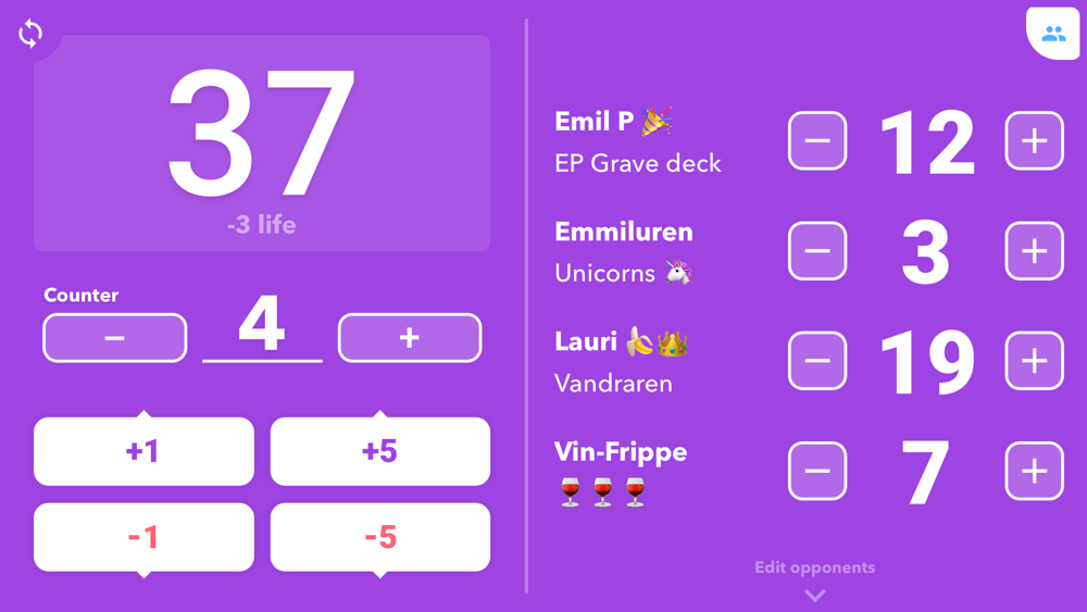 Version 2.0: Now also track poison counters or even commander damage in a game of multiplayer Magic. You can also track number of game wins, perfect for playtesting!