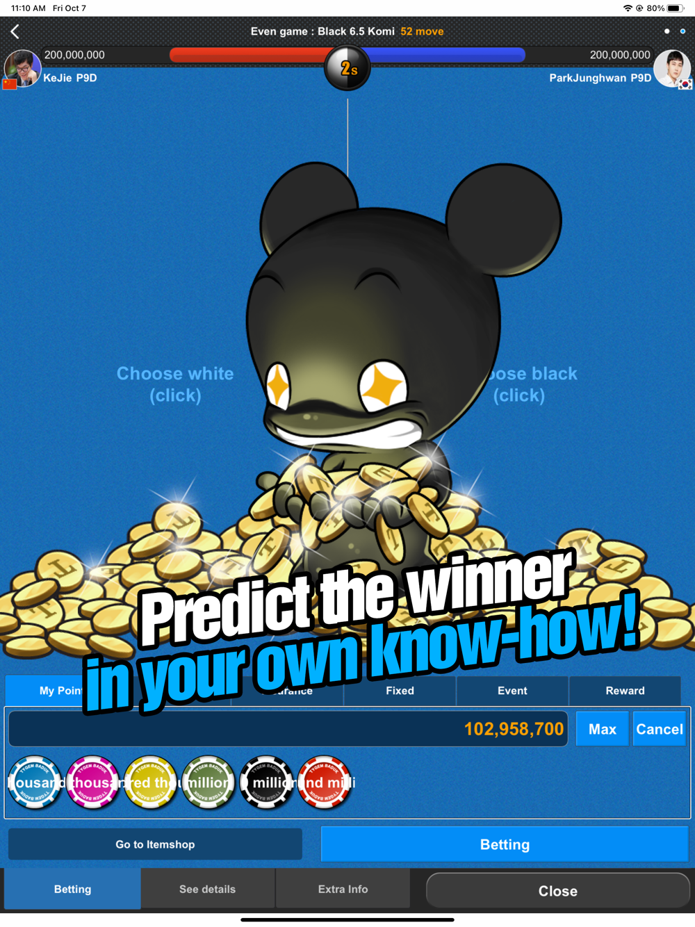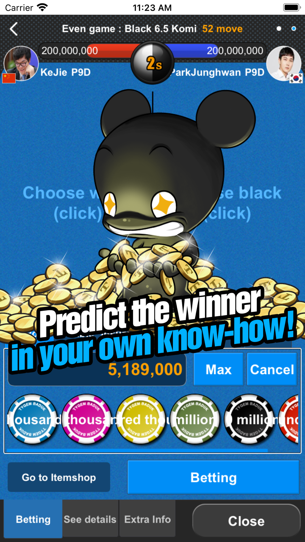 Feel the joy of betting on various contents such as live professional broadcasting, games between Tygem 9Ds, and hidden match