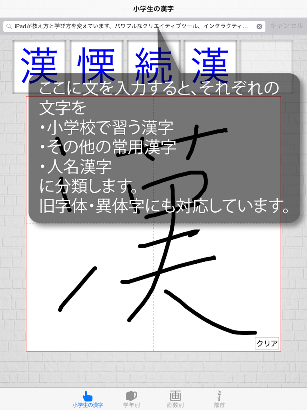 「小学生の漢字」は手書きで入力した漢字の様々な情報を調べる事が出来ます。