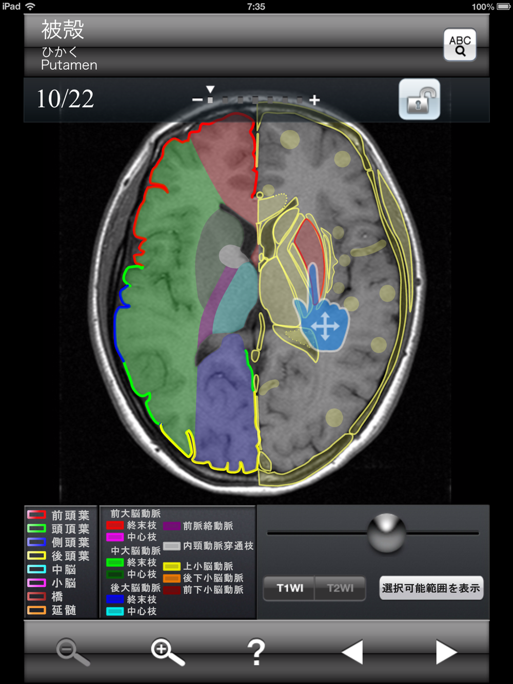 断面図ウォーカー脳MRIをお手持ちのiPad、iPhoneに入れておけば病院など臨床現場での画像診断やムンテラ、医師国家試験対策、どんな時でもお役に立ちます。