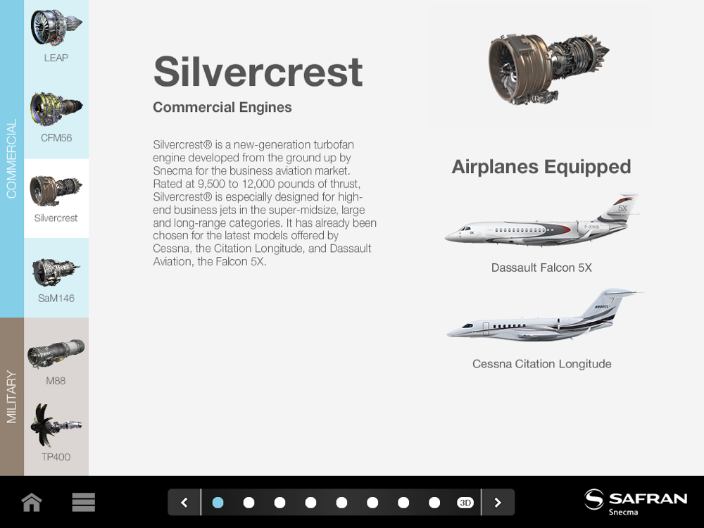 Safran Aircraft Engines is one of the world’s leading manufacturers of aircraft engines. We design, develop, produce and market, alone or in partnership, engines for commercial and military aircraft. Through this user-friendly app, you will discover step by step how our engine work.