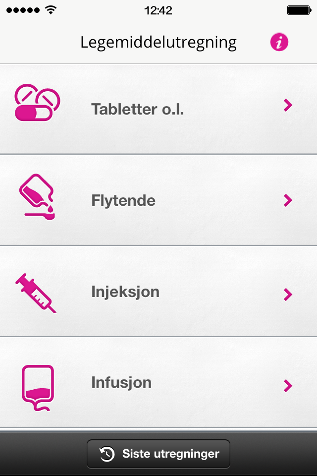 Appen "Legemiddelutregning" er et praktisk verktøy og hjelpemiddel for helsepersonell. «Legemiddelutregning» tar utgangspunkt i aktuell legemiddelform (injeksjon, infusjon, tabletter/kapsler ol.) og veileder brukeren trinnvis frem til riktig svar.