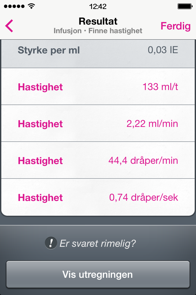 Helsepersonell må alltid vurdere om svaret er rimelig. Legemiddelutregninger bør alltid dobbeltkontrolleres. Appen er et hjelpemiddel og endrer ikke helsepersonells ansvar knyttet til eventuell feilmedisinering.