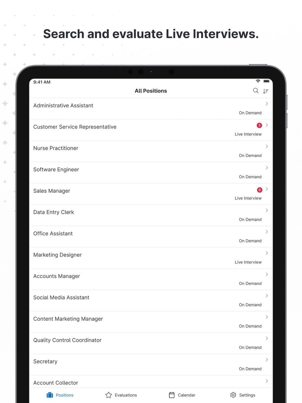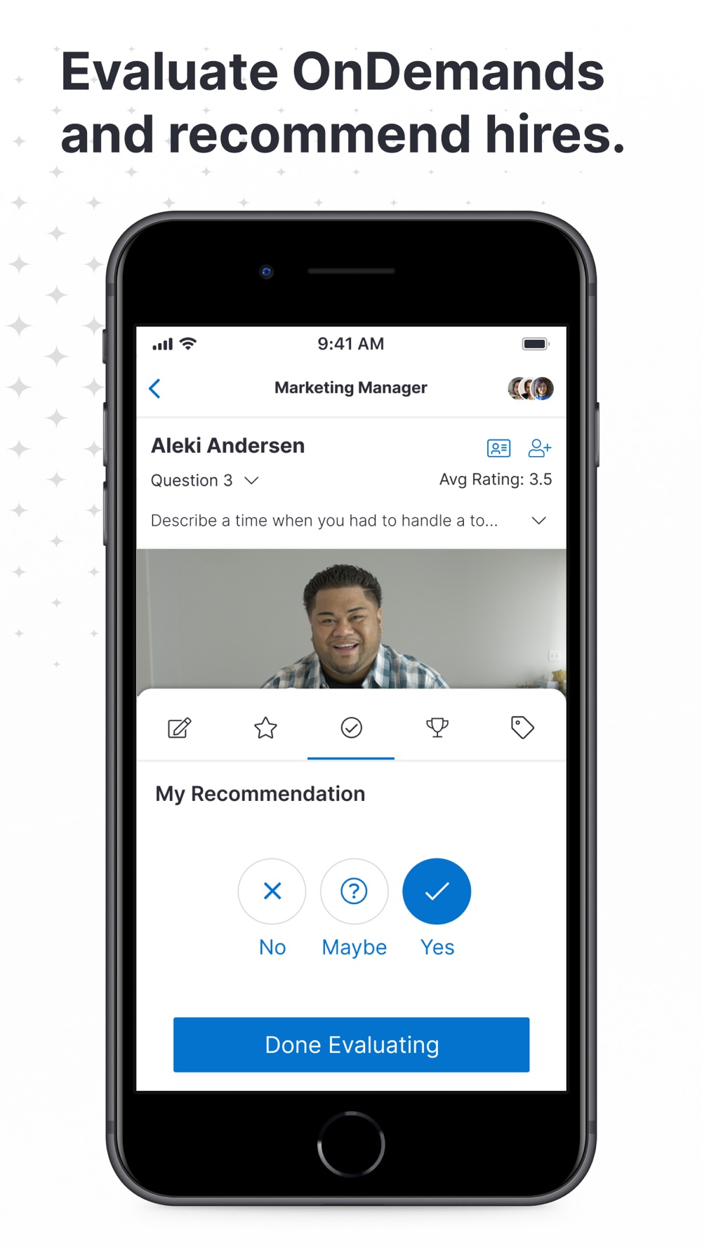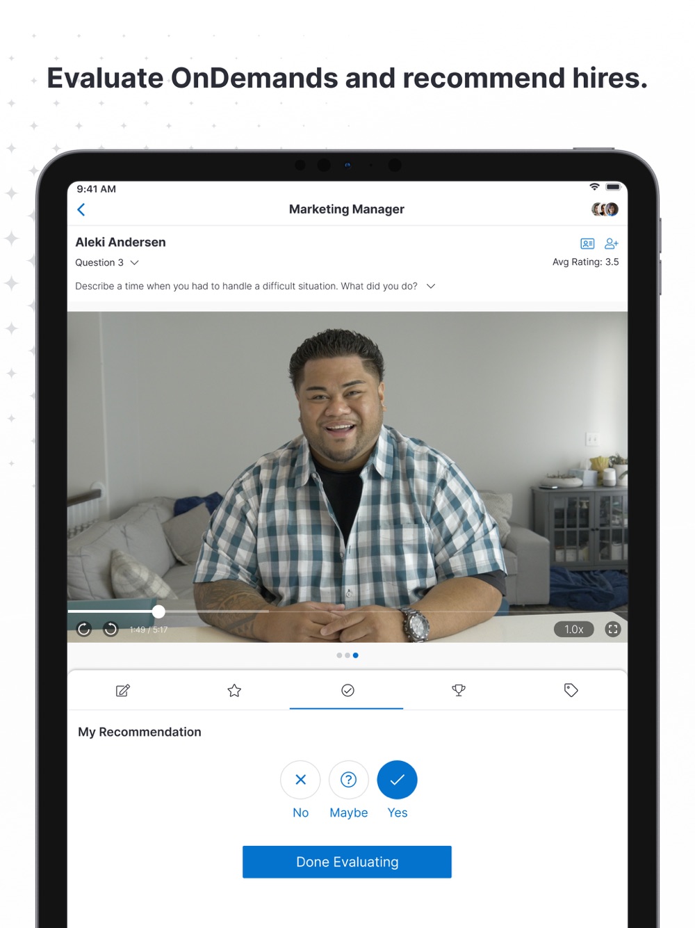Hire the best talent faster. HireVue helps you as a recruiter or hiring manager to view and share pre-recorded interviews, evaluate and rate candidates, provide real-time feedback, and conduct Live interviews all from the convenience of your mobile device.