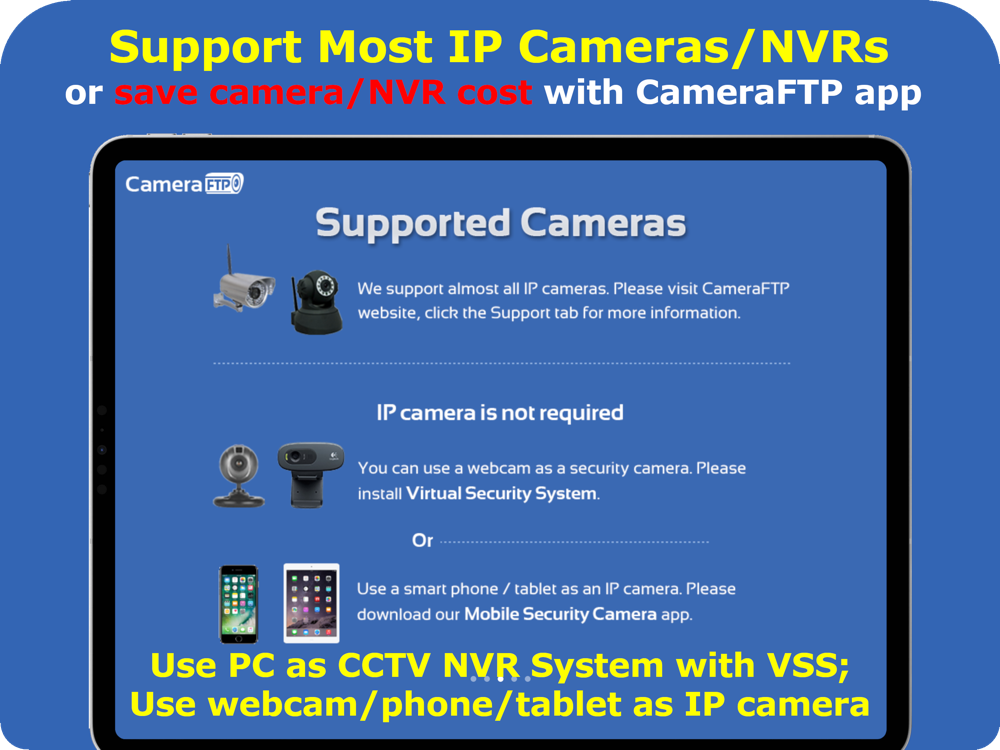 Compared with other security or surveillance systems, our service is extremely easy to setup, the cost is dramatically lower. It supports any IP camera, webcam or smartphone, no professional installation is required. It is also more secure as it saves data to CameraFTP.com secure data center. You can monitor the scene live or play back the recorded footage from anywhere.