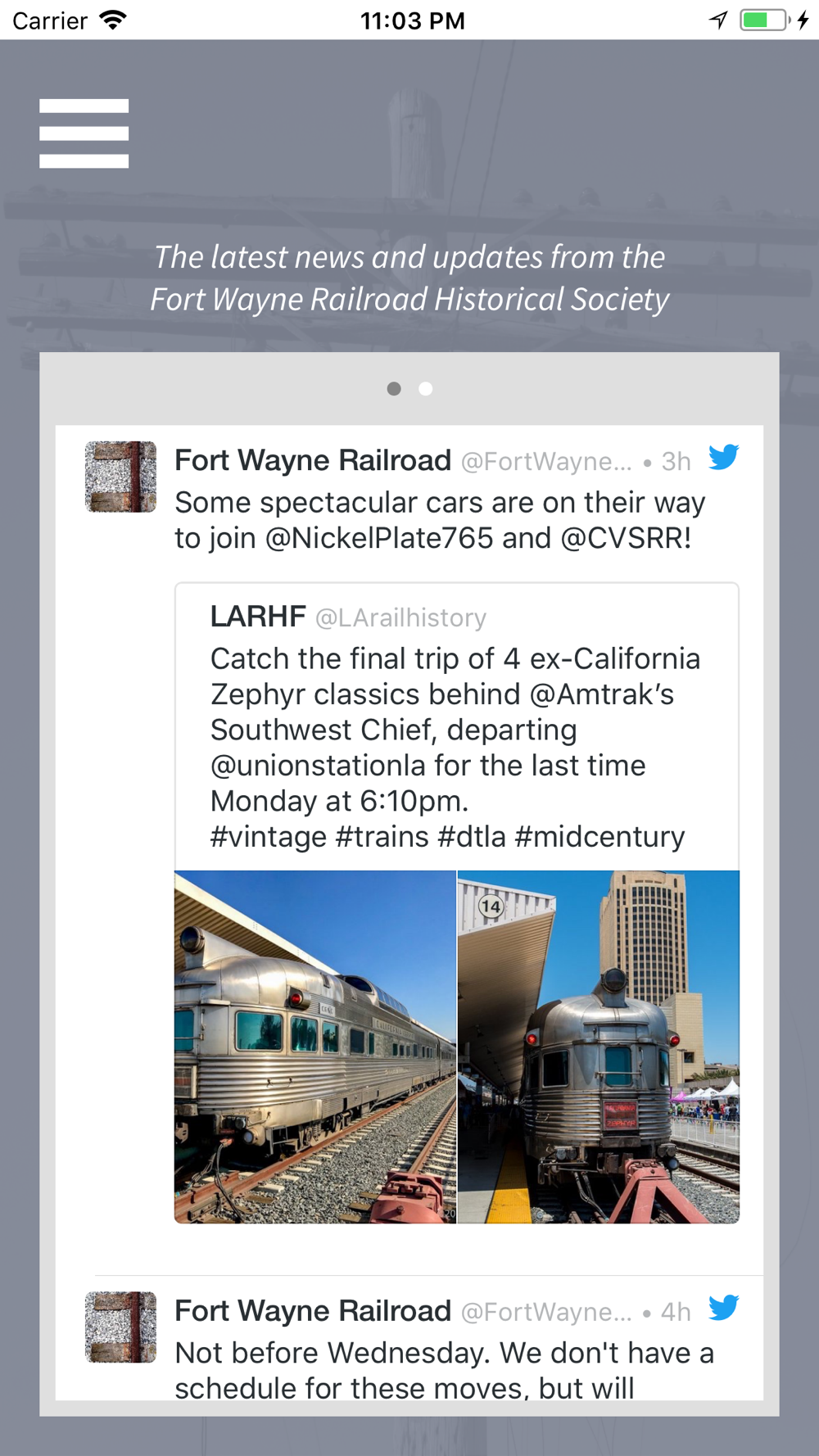 • News, Event, and Schedule listings directly from fortwaynerailroad.org