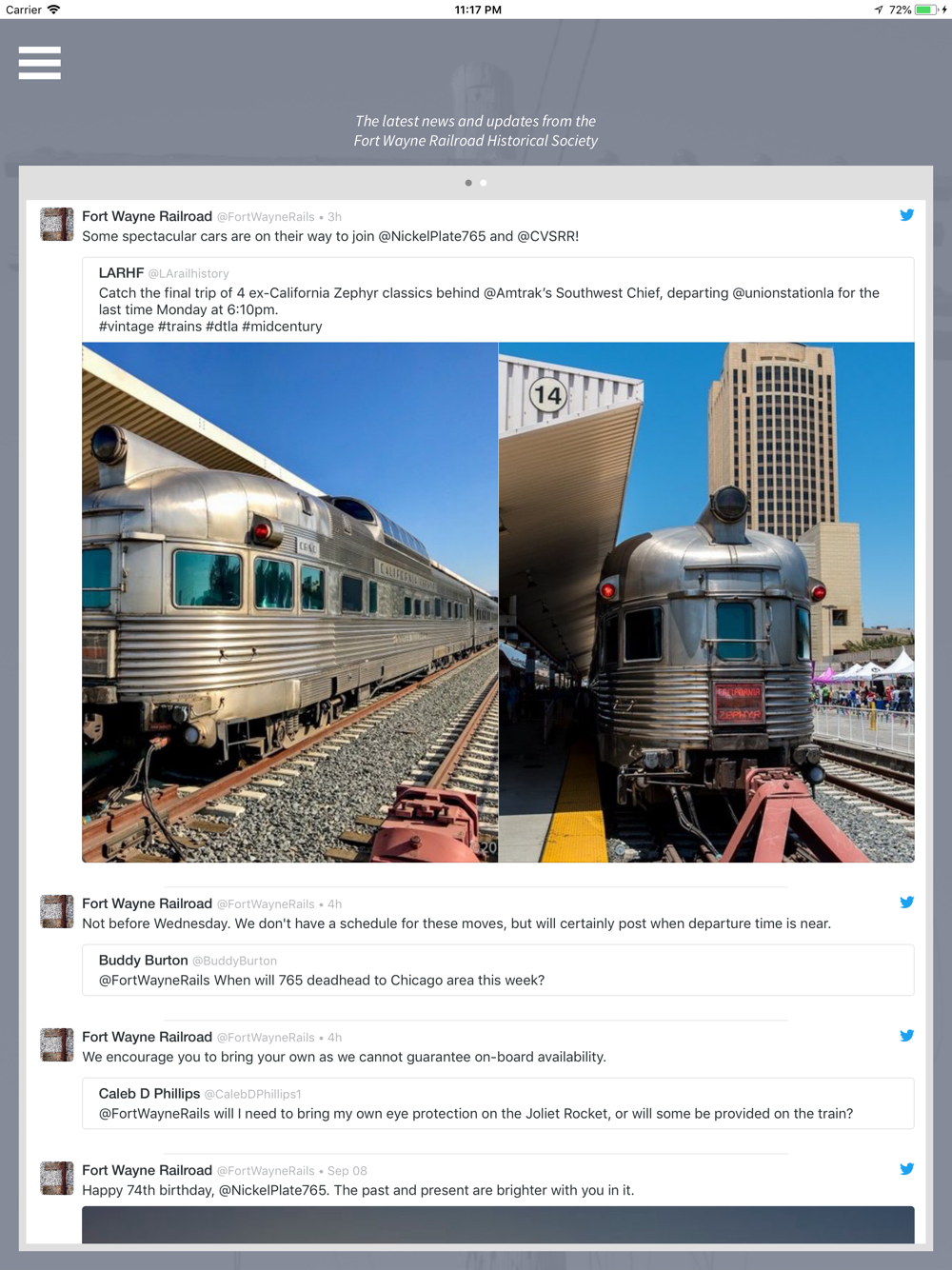 • Real-time Twitter feeds from @nickelplate765 and @fortwaynerails (no Twitter account required)