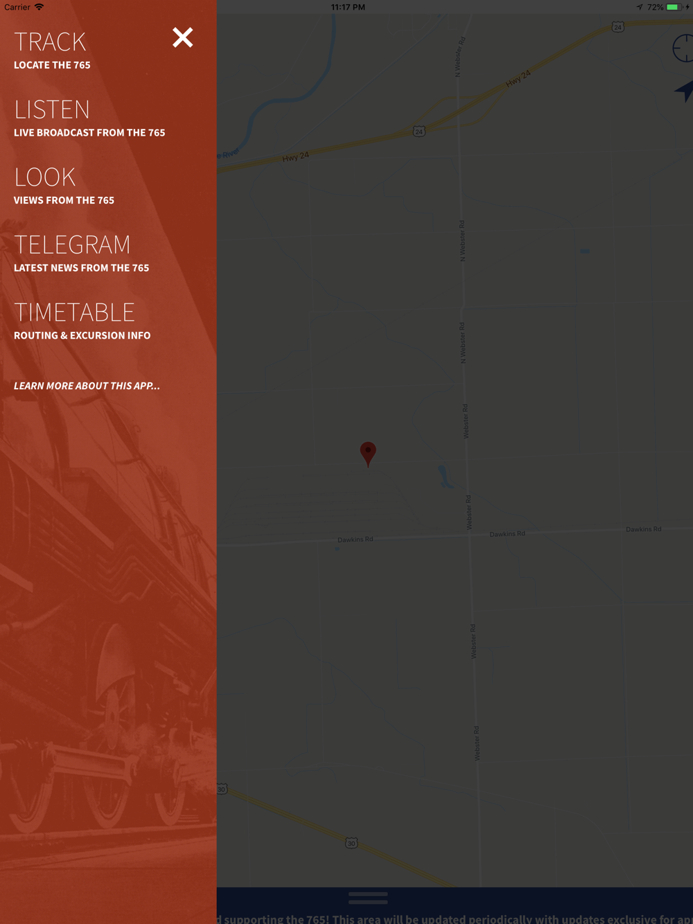 NKP 765 features real-time GPS location of the locomotive and its excursion routes keep up to date with the FWRHS with built in Twitter feeds, News and Event page, and a subscription to the railroad historical society's monthly email newsletter.