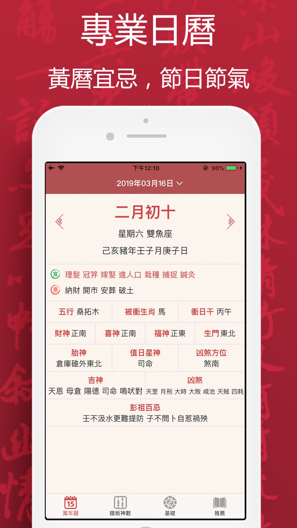 ⊙內建老黃曆擇吉、萬年曆農曆查詢,今日宜忌、神煞方位、值日星神、時辰吉凶、九宮飛星、風水方位,一目瞭然!