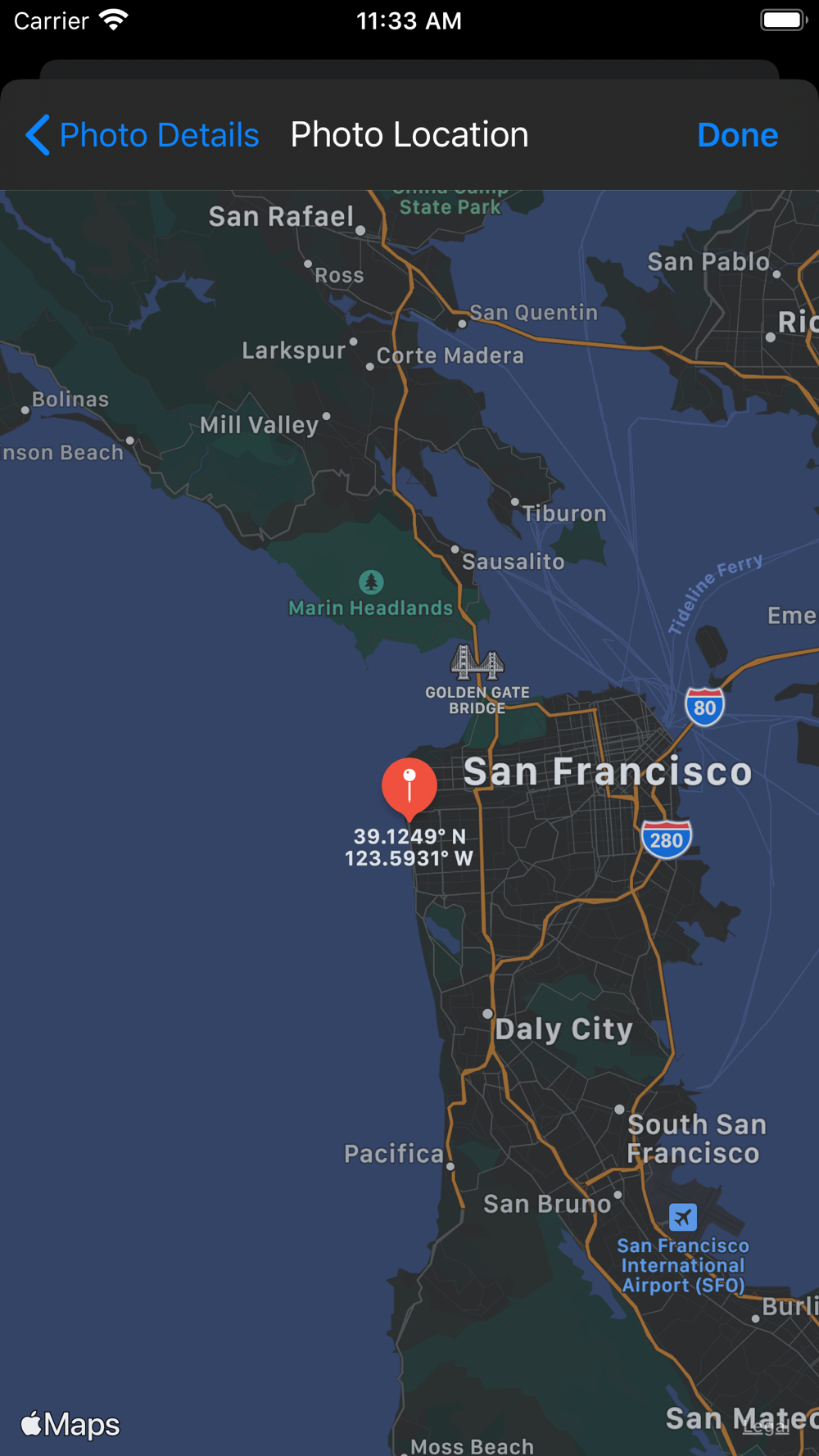 Use the photo detail viewer to see the exact location a photo was taken on a map, in addition to other details such as aperture, focal length and lens model, and containing Apple Photos album. You can also view the full, raw EXIF metadata for each photo.