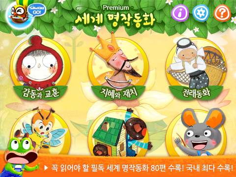 성우가 들려주는 이야기의 생생함과 주인공을 터치시 이야기에 맞게 움직이는 인터랙션들로 인하여 아이들은 마치 자신이 주인공이 된 듯이 몰입하며 지혜와 슬기를 배로 얻을 수 있습니다.