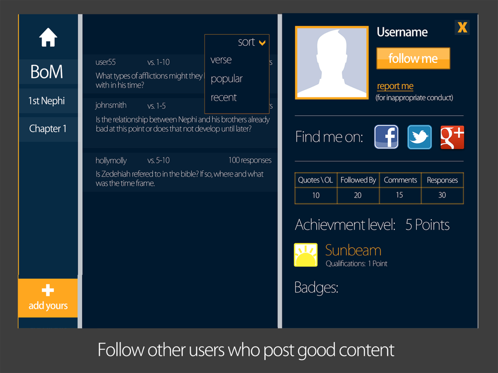 • Post comments or questions visible by other users based on a verse or multiple verses.