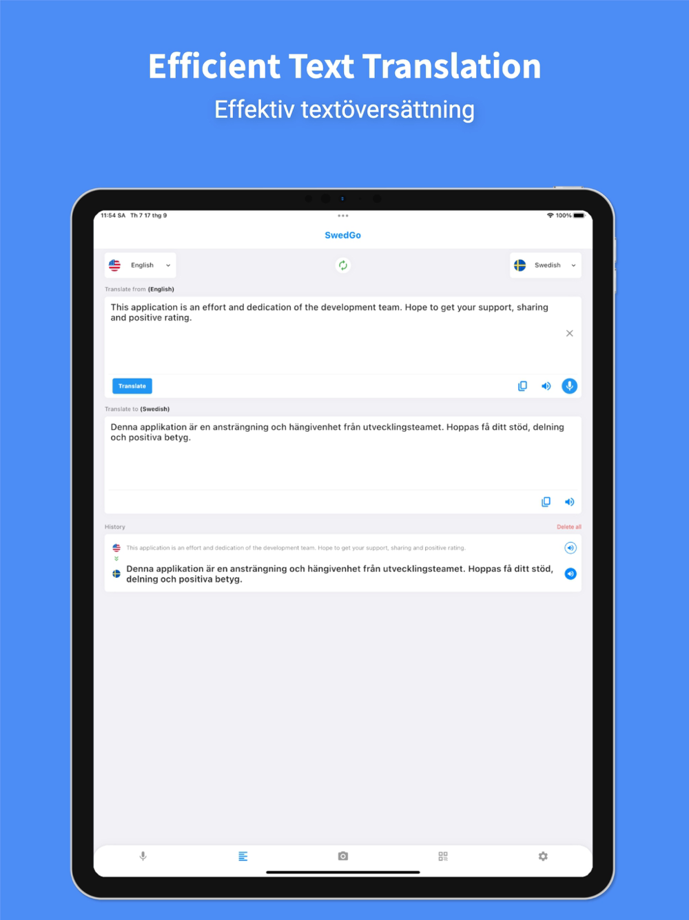 Hi ! SwedGo is the leading swedish Translator with a lot of outstanding features such as accurate voice translator, translate any text in 45 languages to swedish or swedish to any language such as: English, Korean, German, Japanese, Vietnamese, Chinese, etc and extremely useful photo translating feature or learn swedish more easily.