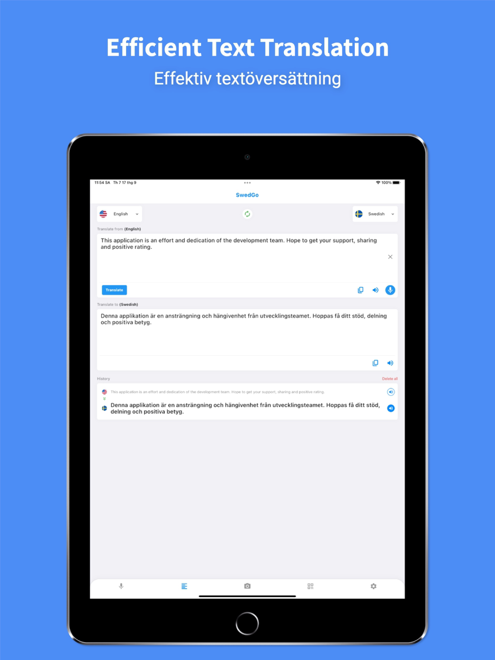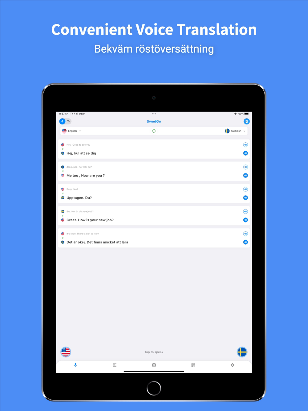 The voice translating feature translates to swedish and vice versa, translate text to voice with typing from keyboard.