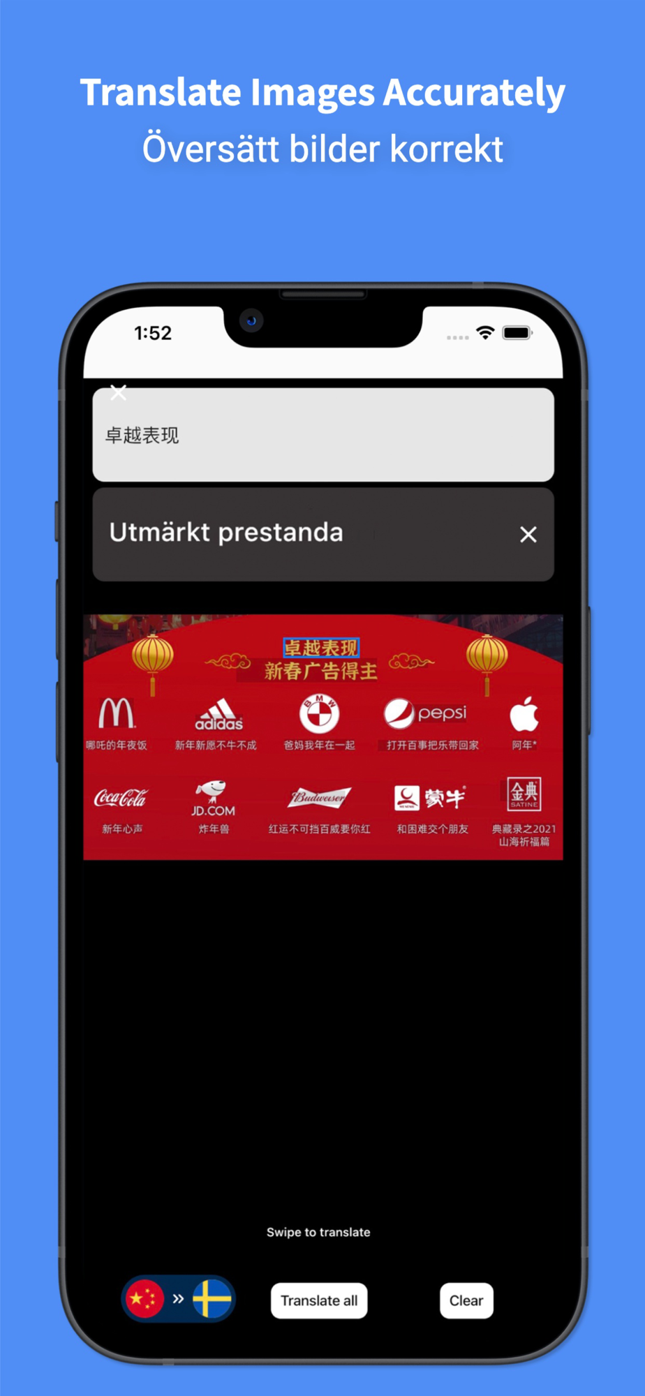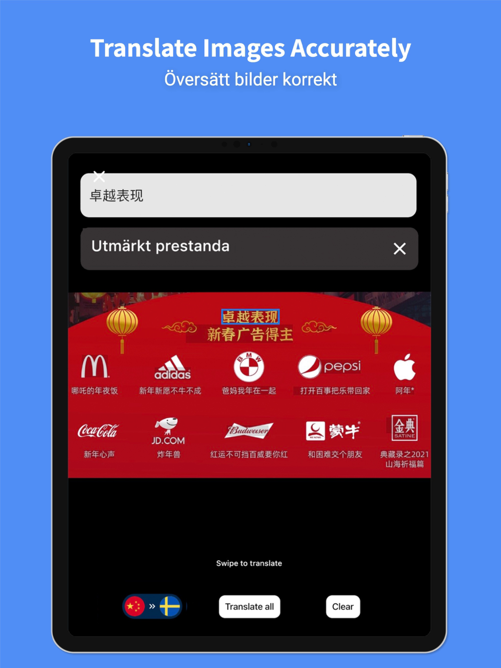 • Use your camera to instantly translate menus or signs and more from any language to swedish.