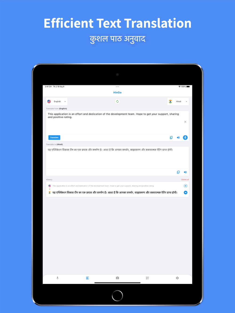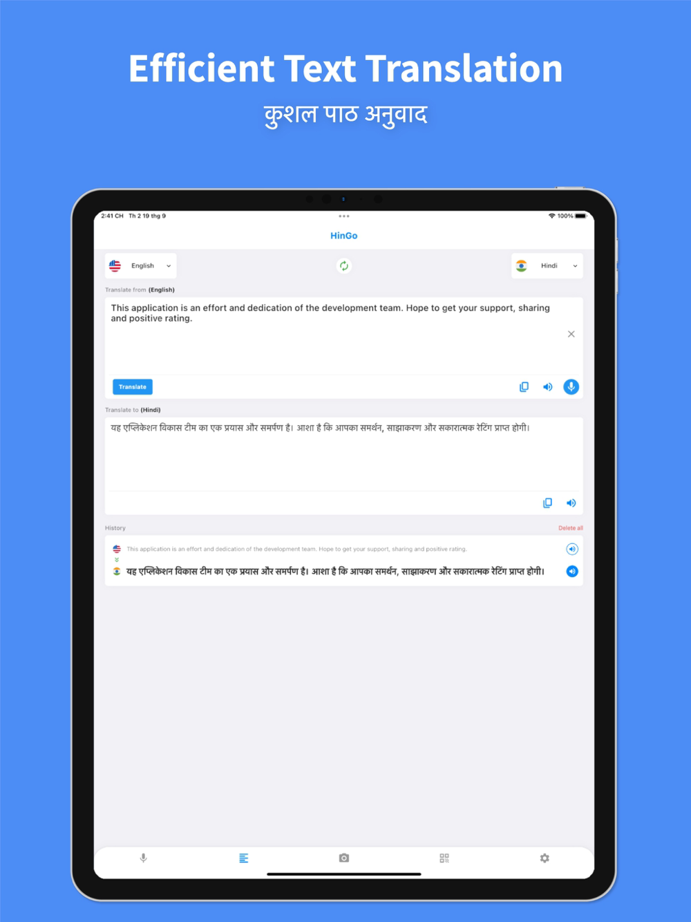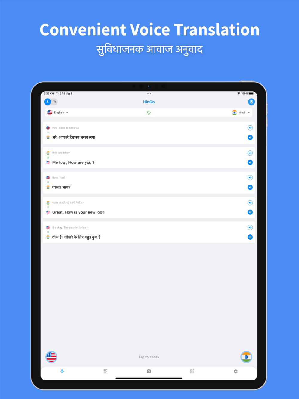 Hi ! HinGo is the leading Hindi Translator with a lot of outstanding features such as accurate voice translator, translate any text in 45 languages to hindi or hindi to any language such as: English, Korean, German, Japanese, Vietnamese, French, etc and extremely useful photo translating feature or learn hindi more easily.