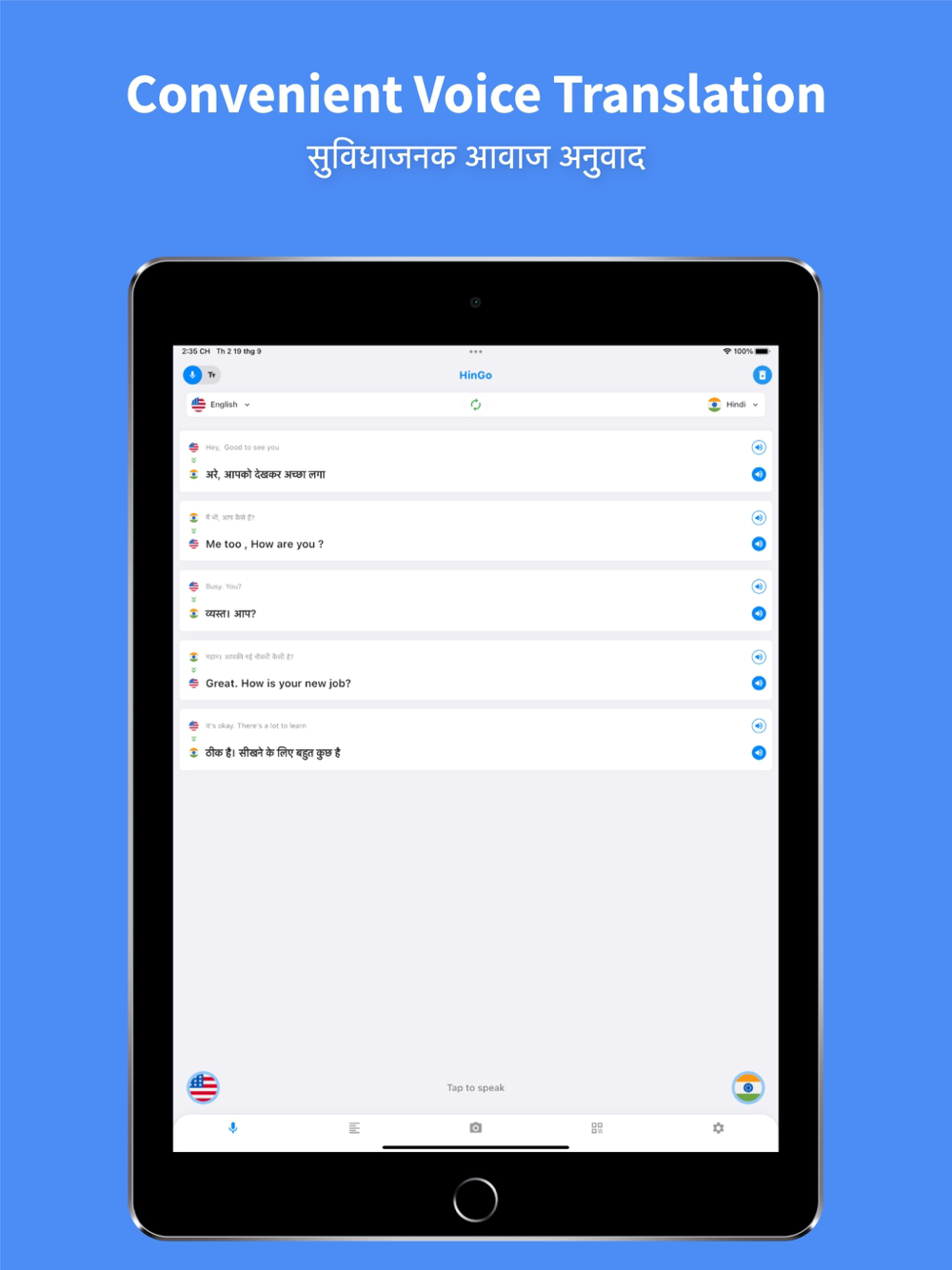 The voice translating feature translates to hindi and vice versa, translate text to voice with typing from keyboard.