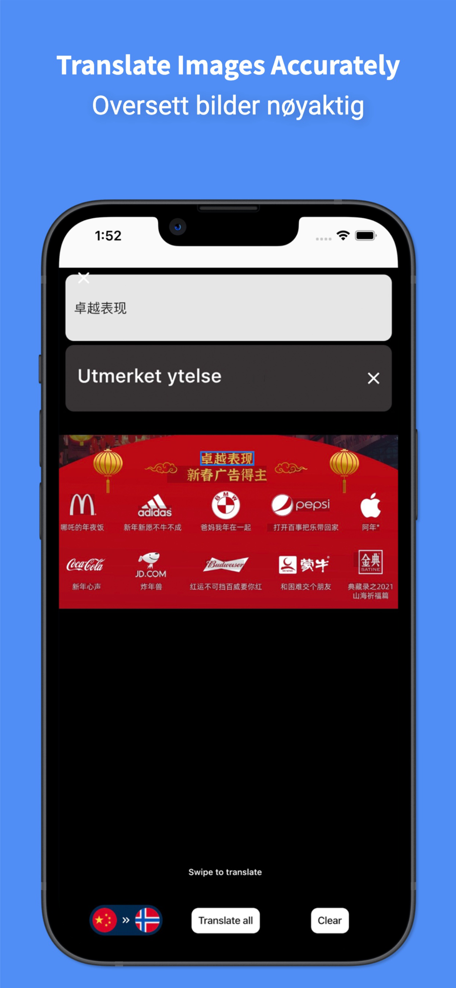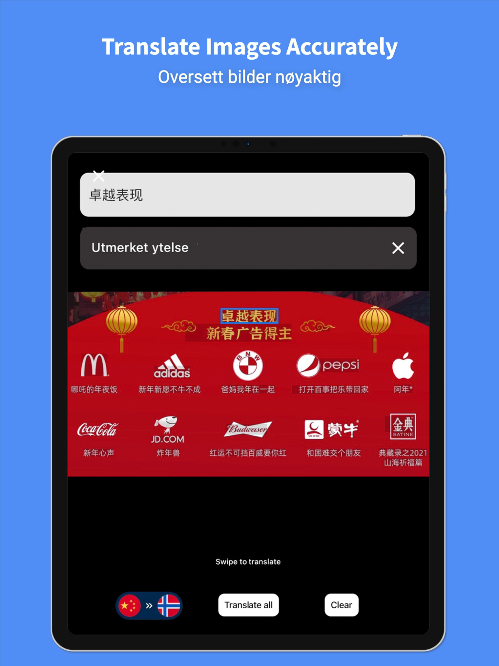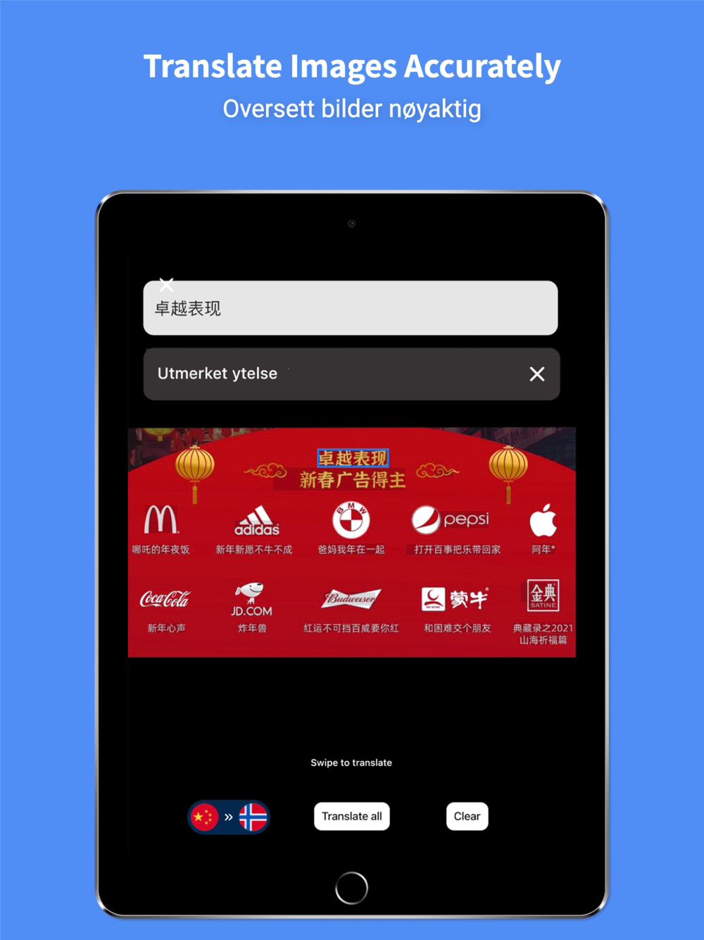 • Use your camera to instantly translate menus or signs and more from any language to norwegian.