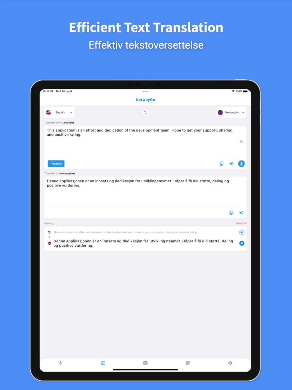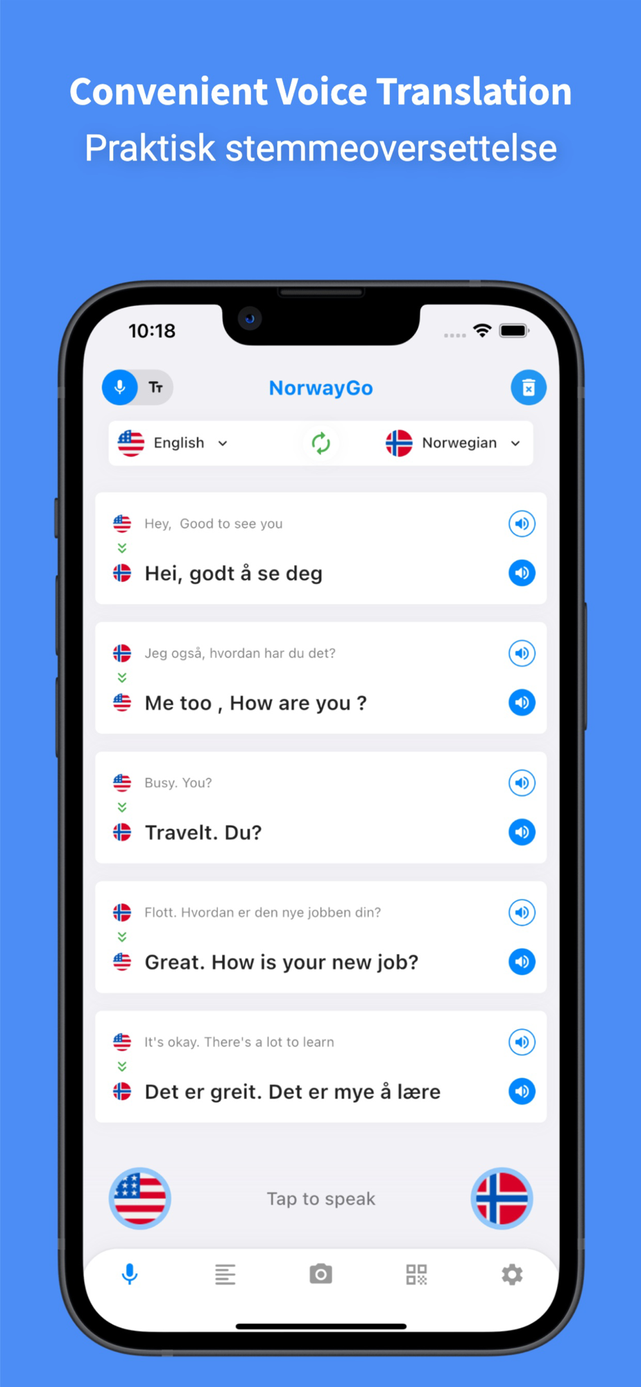 The voice translating feature translates to norwegian and vice versa, translate text to voice with typing from keyboard.