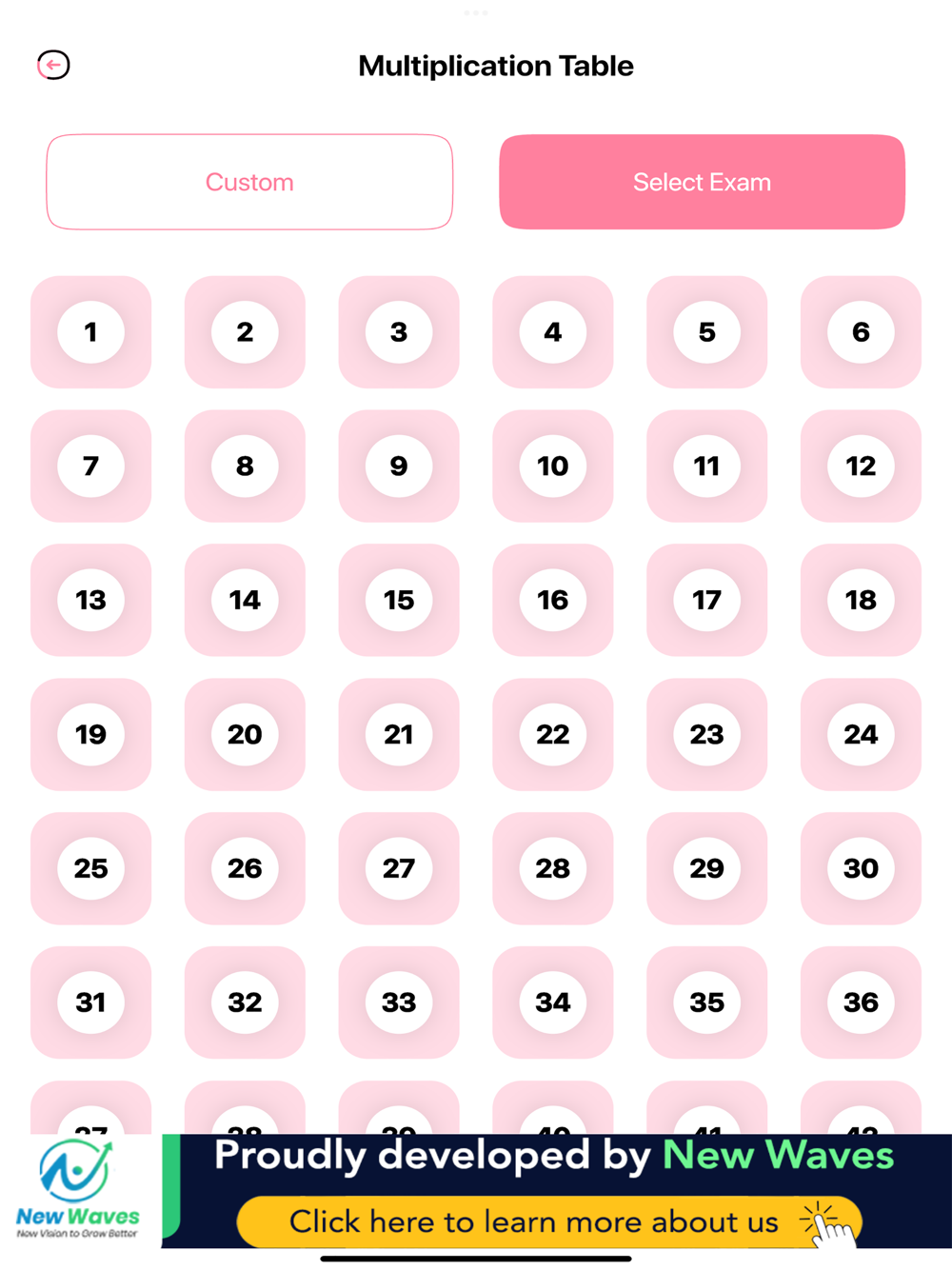 NewWaves Maths Tables Learning App is a Maths timetable learning app for all ages, along with audio support. It's easy to use, and no parental support is required. The App will display all tables, and the App will speak all the multiples one by one, which makes learning easy.